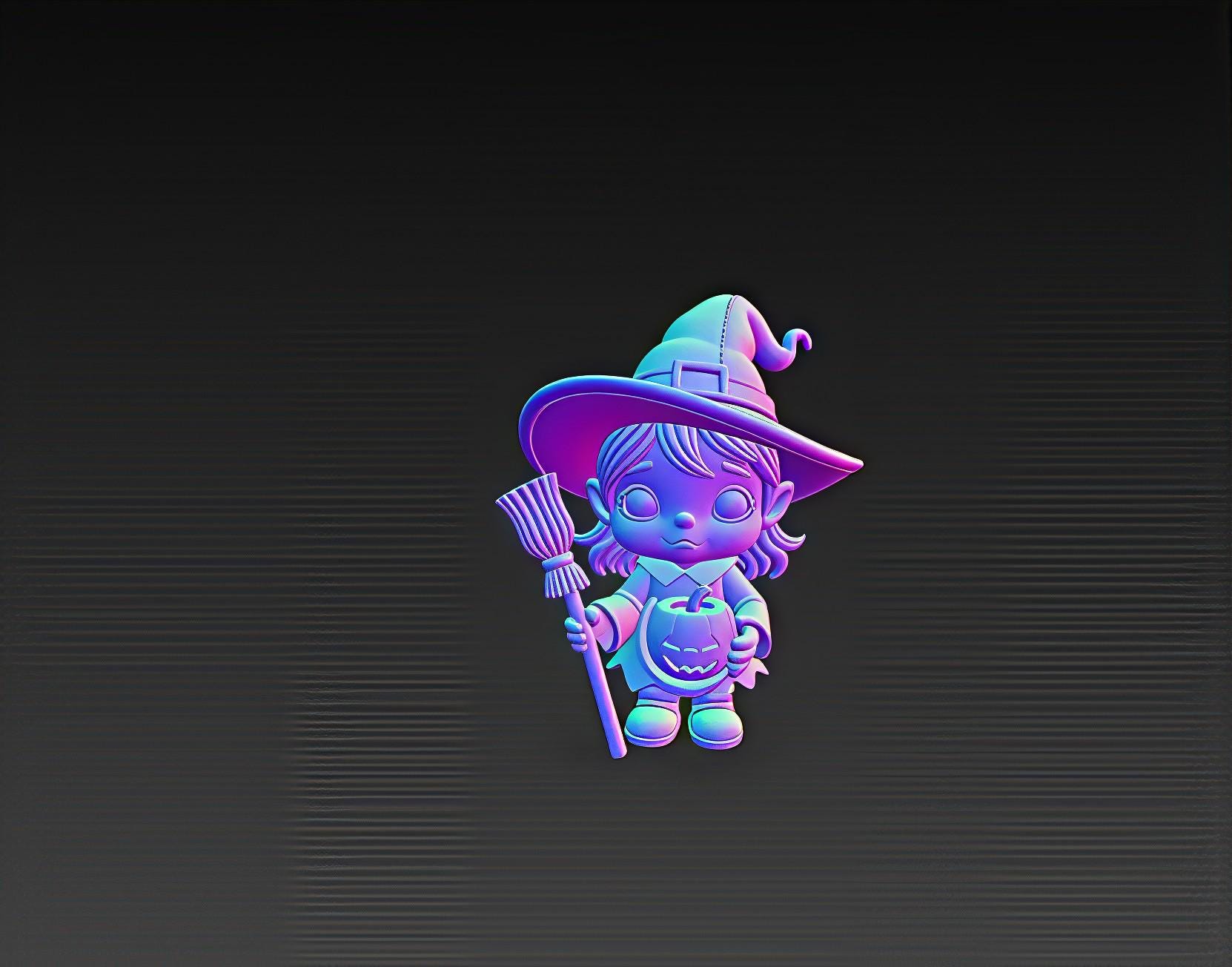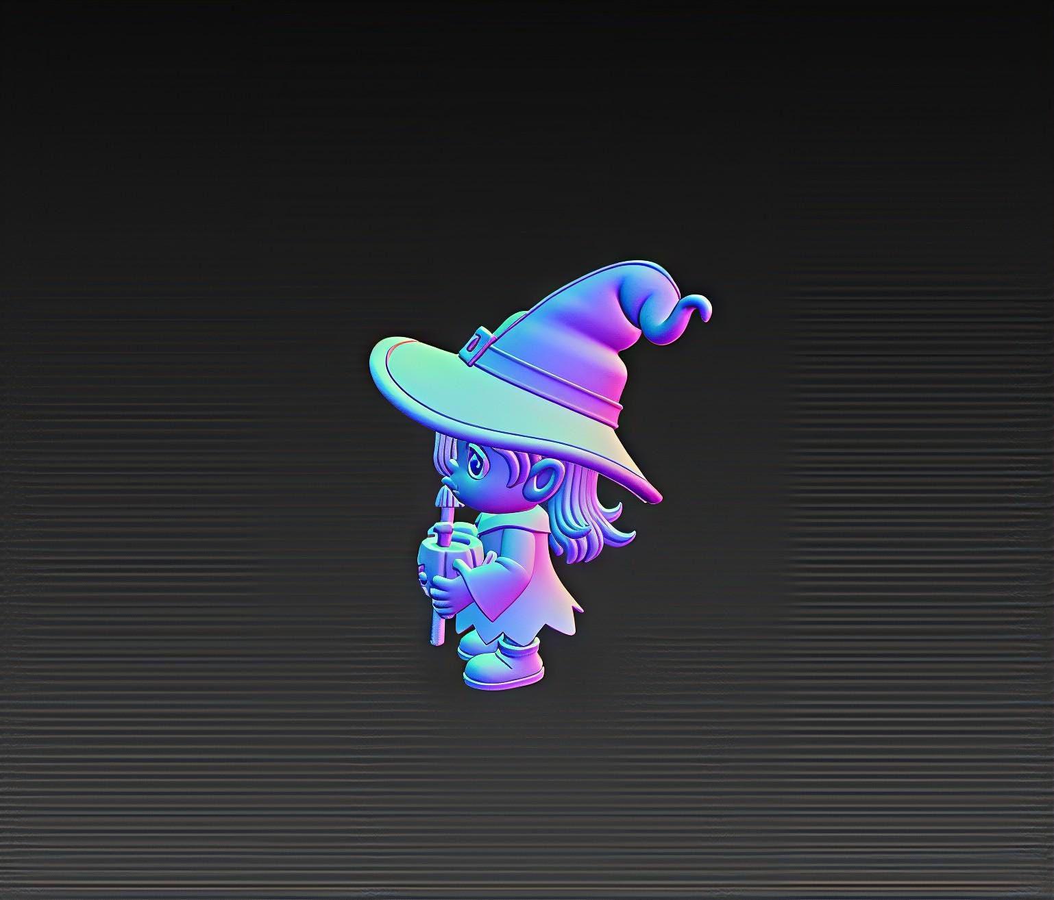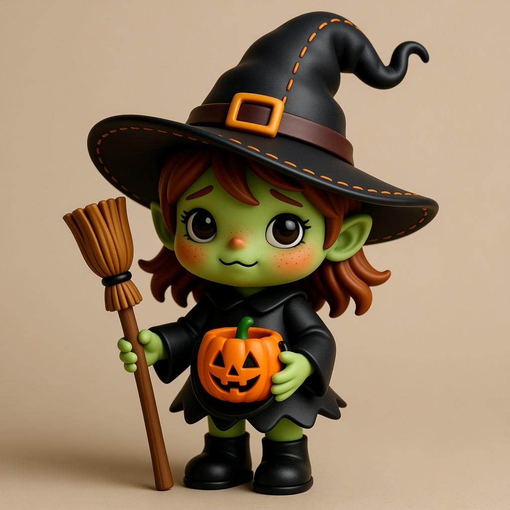 Adorable chibi green witch holding a pumpkin and broom, perfect for Halloween displays, spooky collections and magical decor. Digital STL file.