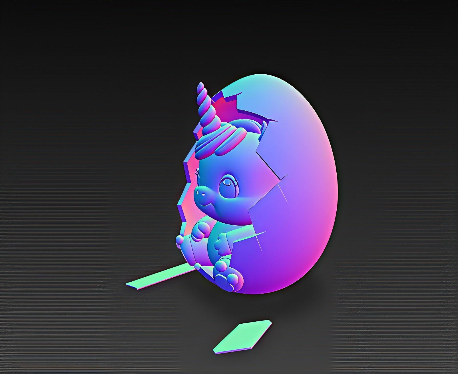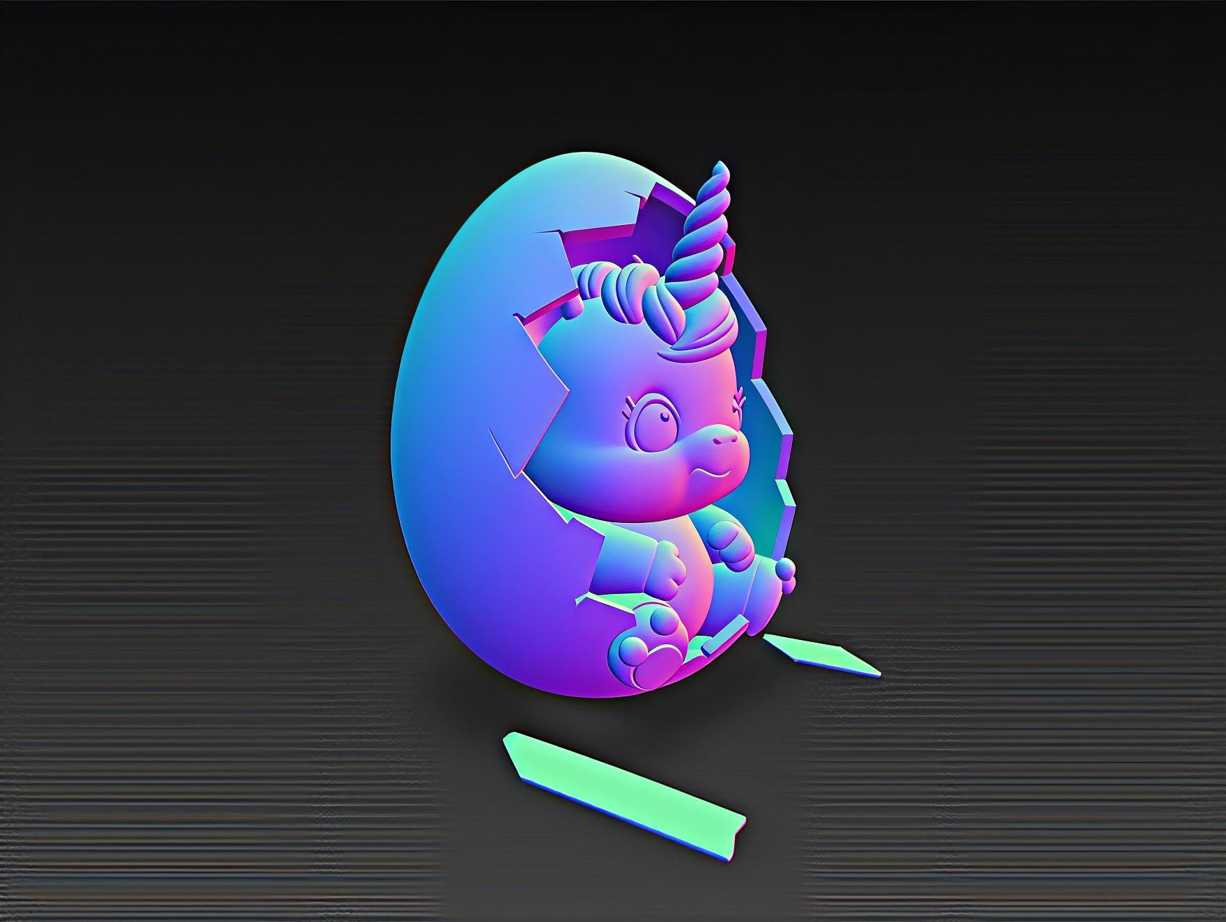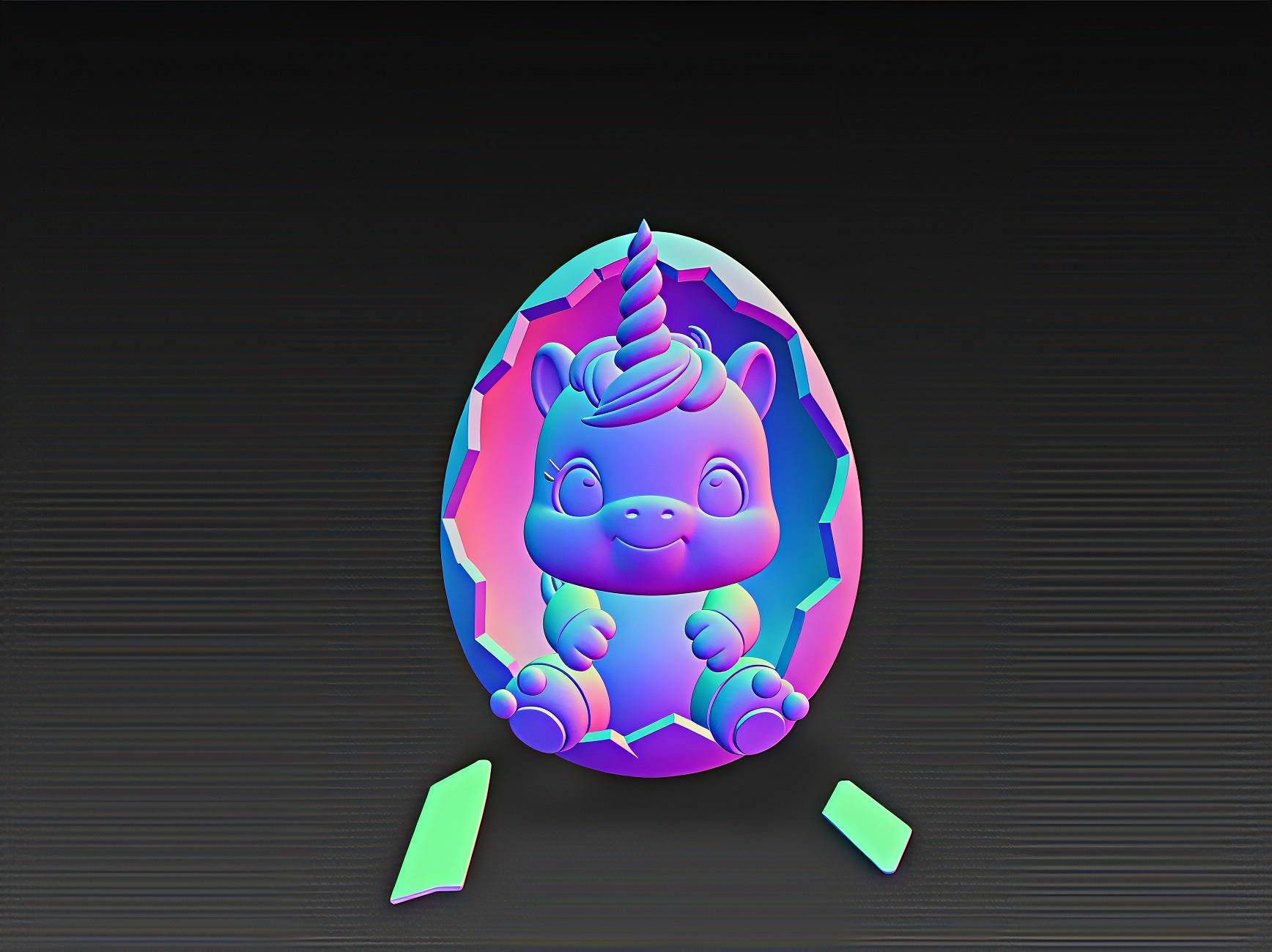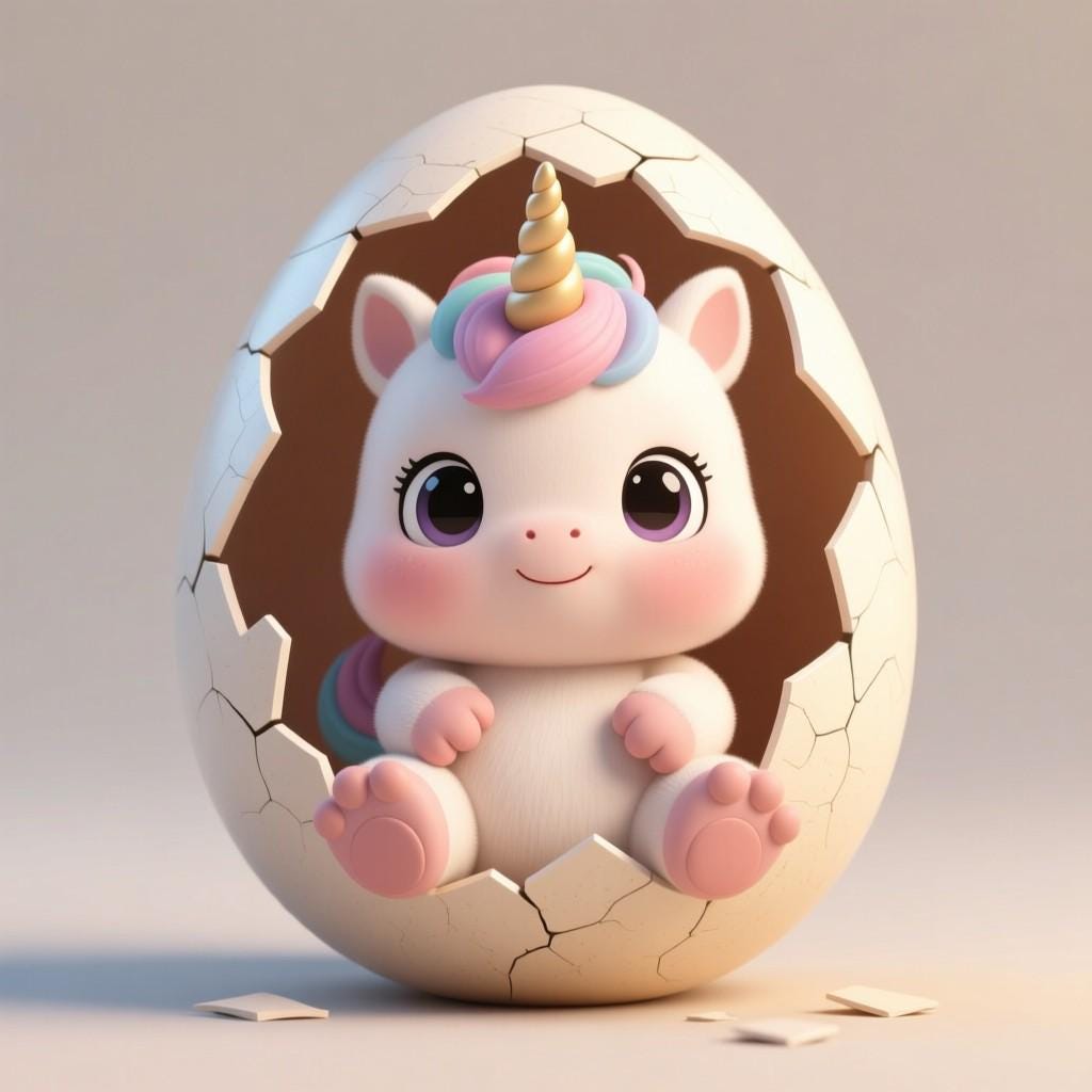 Adorable chibi baby unicorn hatching from an egg, perfect for fantasy lovers, magical decor and collectible displays. Digital STL file for 3D printing.