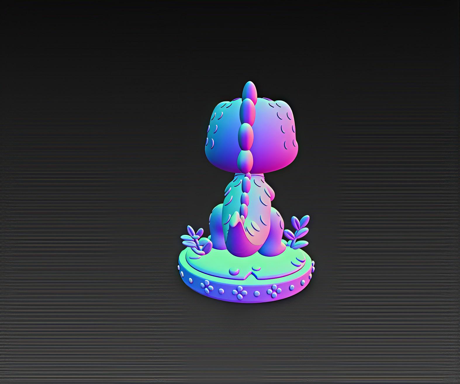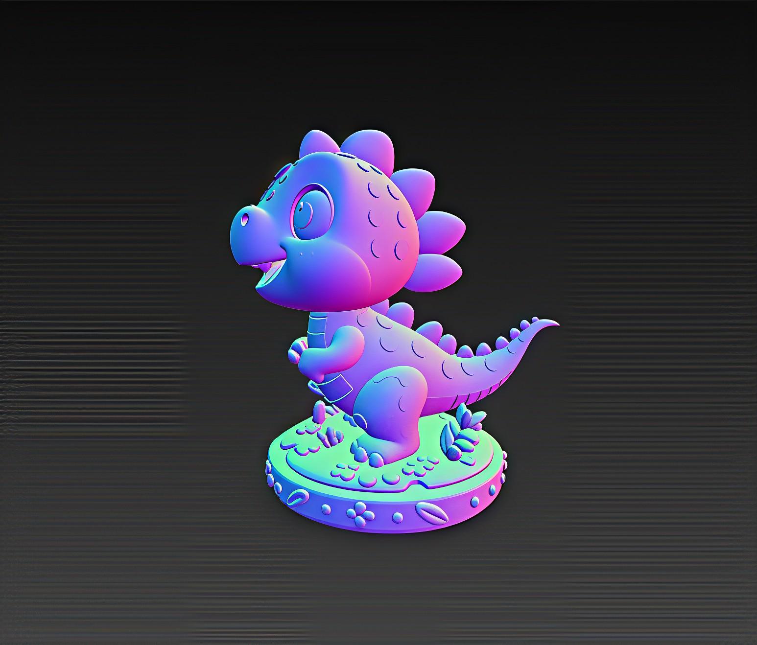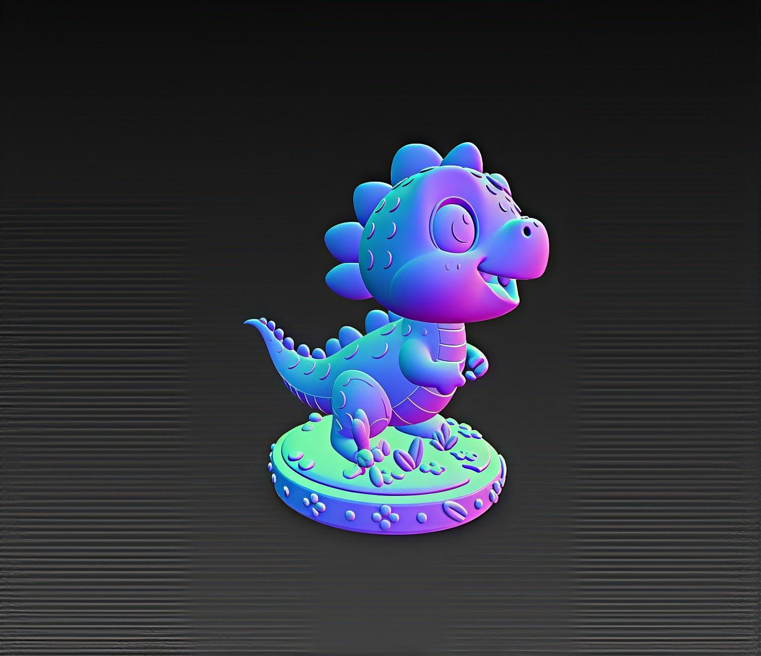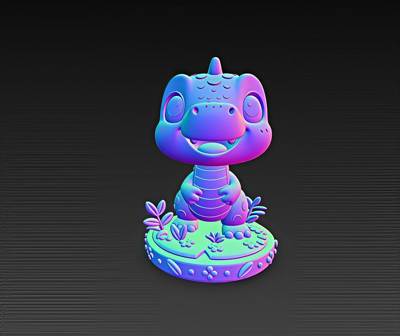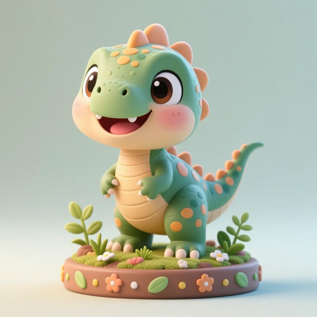 Adorable chibi baby dinosaur standing on a floral base, perfect for Jurassic fans, kids room decor and fantasy collections. Digital STL file for 3D printing.
