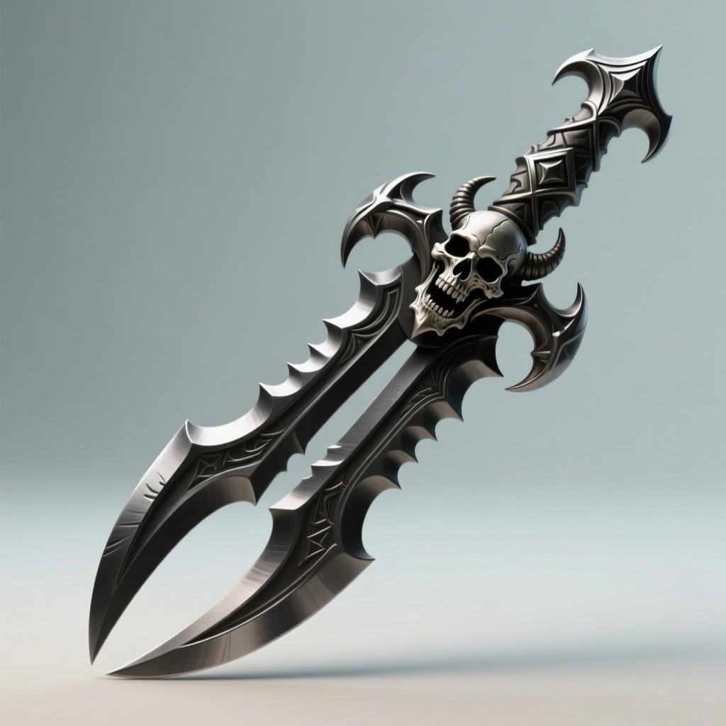 A gothic fantasy sword with horned skull hilt and dual-edged demonic blade. Perfect for RPG campaigns, cosplay props, Halloween decor and collectors. Digital STL file for 3D printing.