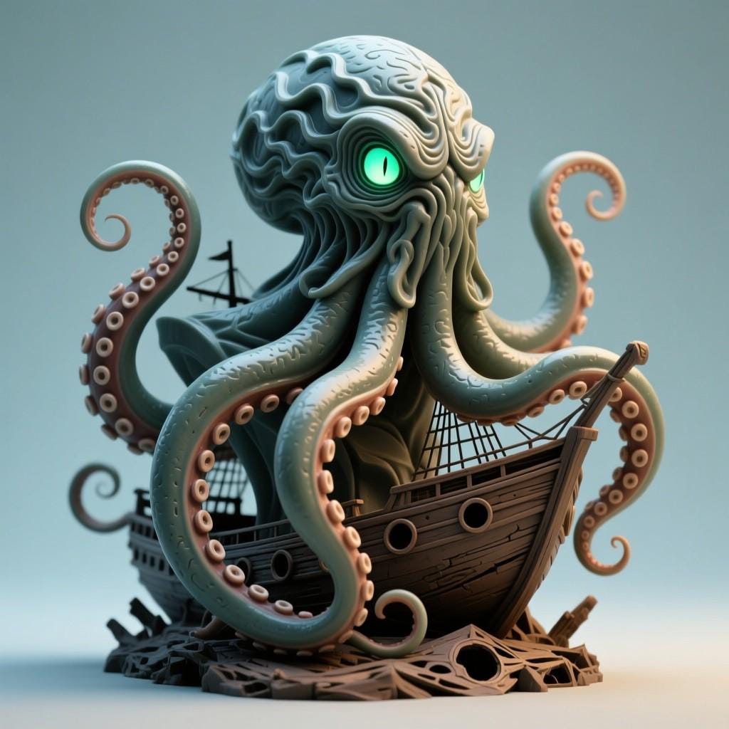 Terrifying Cthulhu Kraken STL file featuring a mythical sea monster with glowing eyes and a wrecked ship base. Perfect for fantasy fans, dark décor collectors, and 3D printing enthusiasts. Digital file only – no physical item.