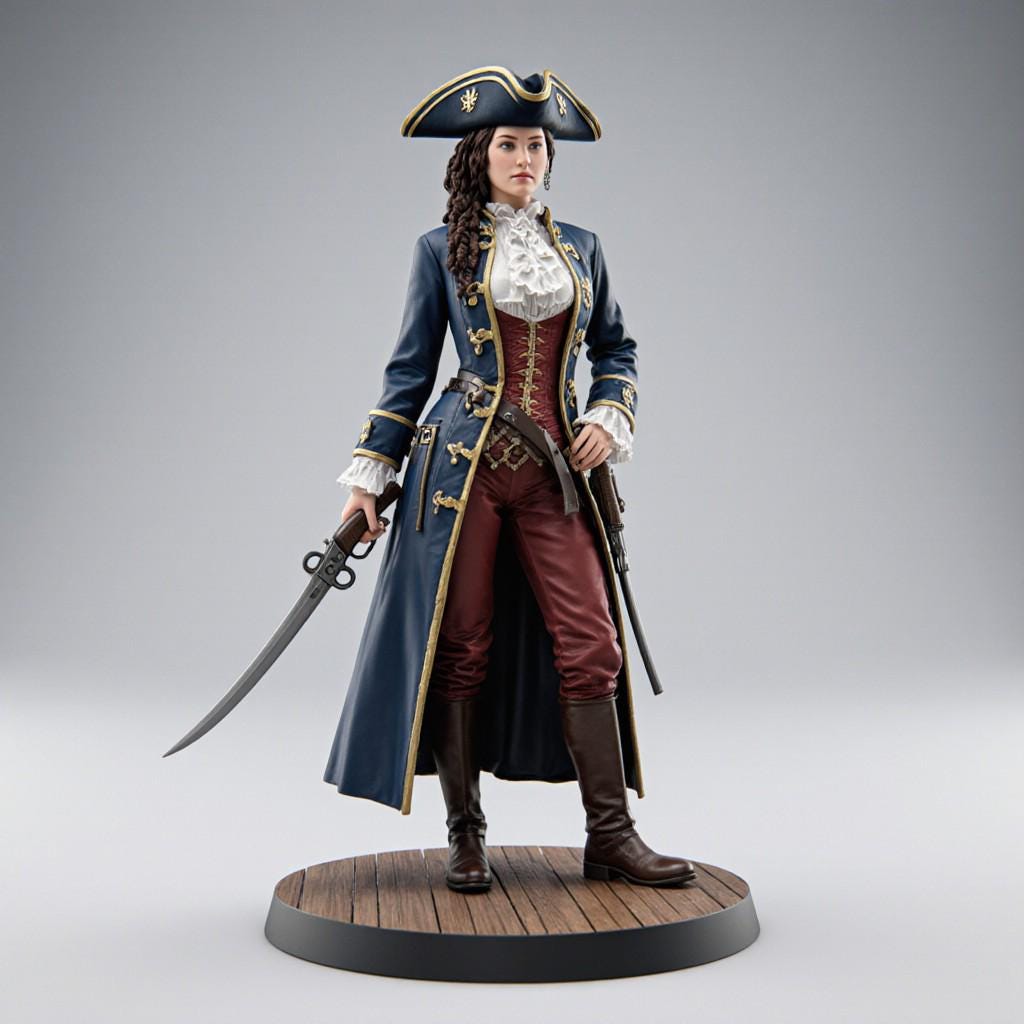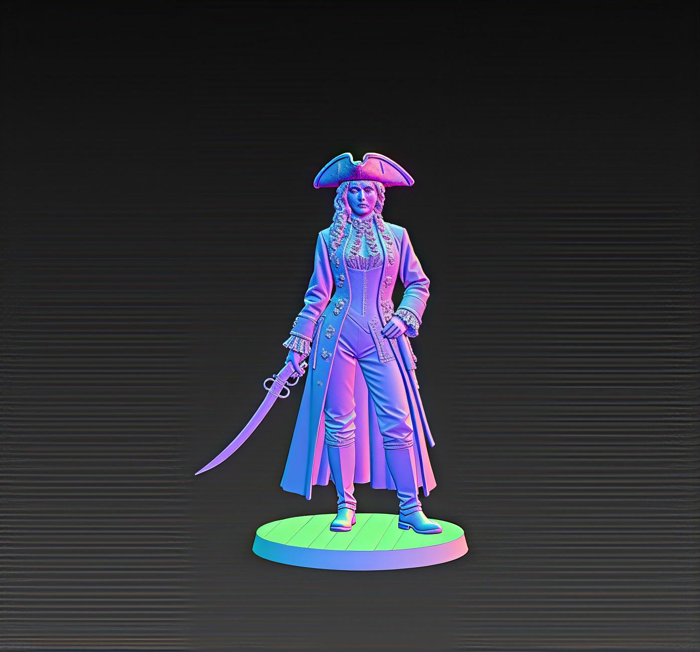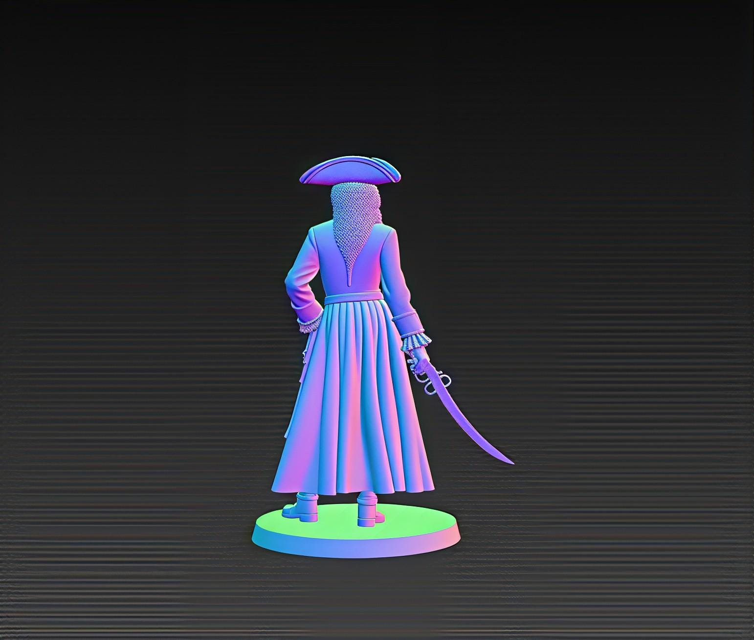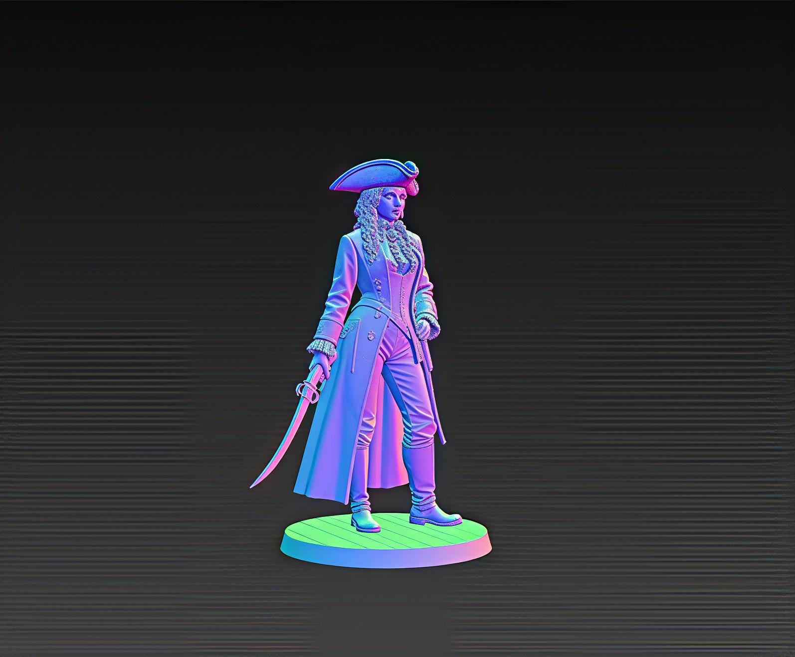 High-detail STL file of a female pirate captain with sword and classic corsair attire. Perfect for 3D printing collectibles, tabletop miniatures, or nautical fantasy décor. Digital download only.
