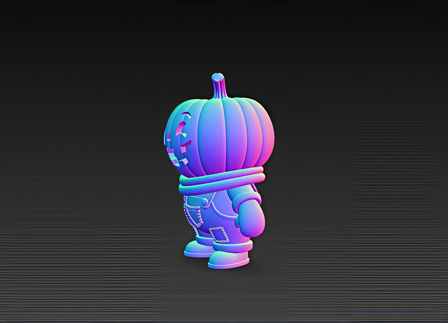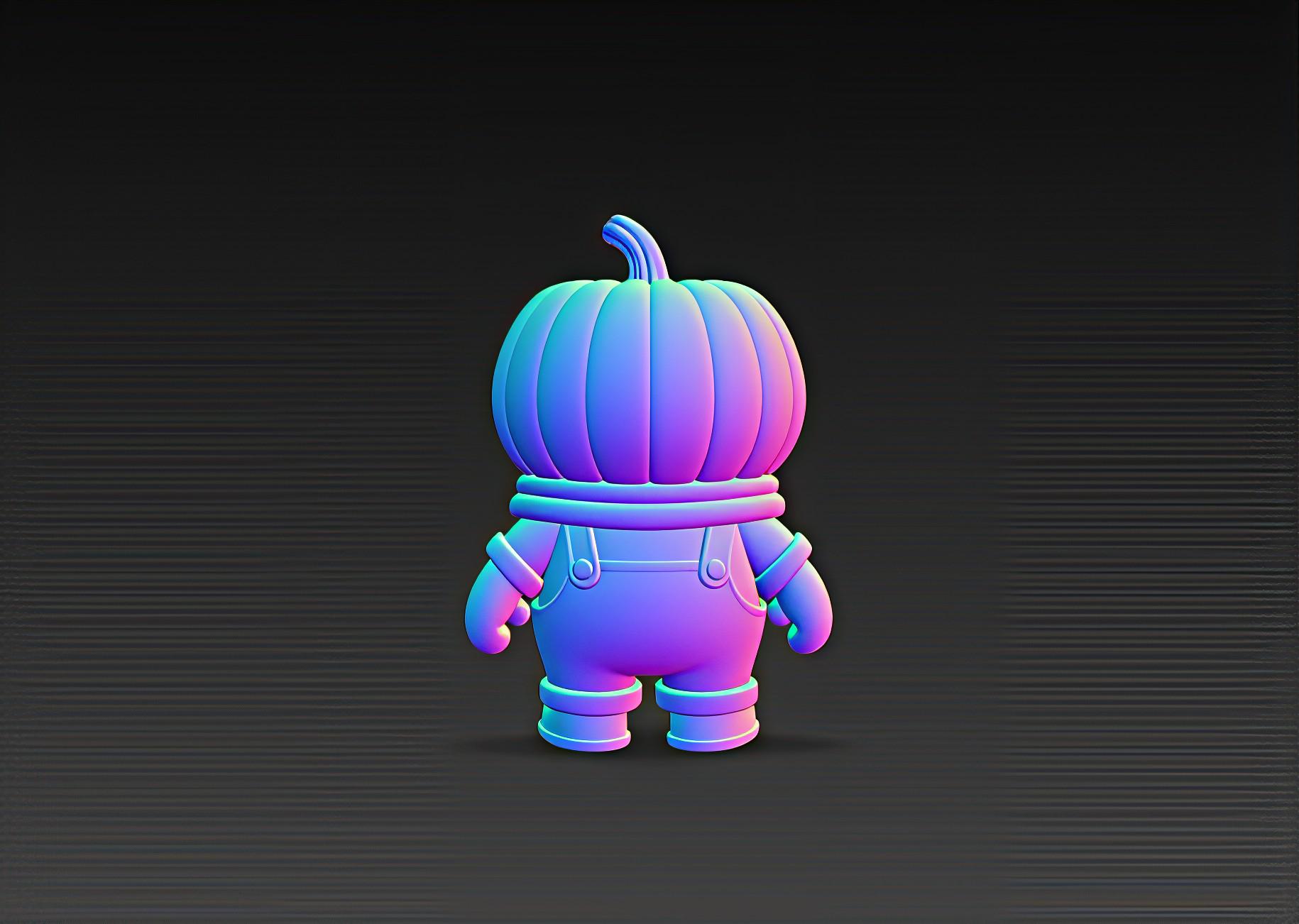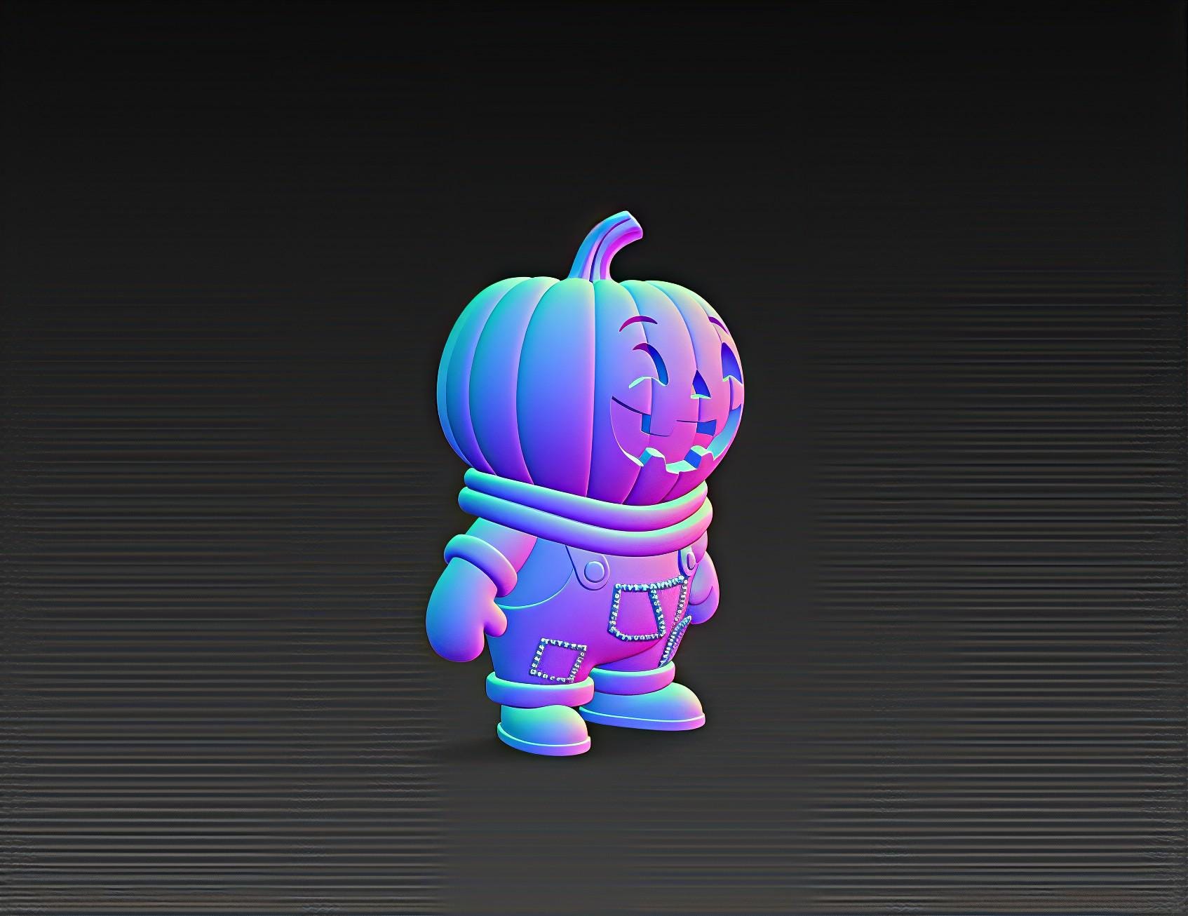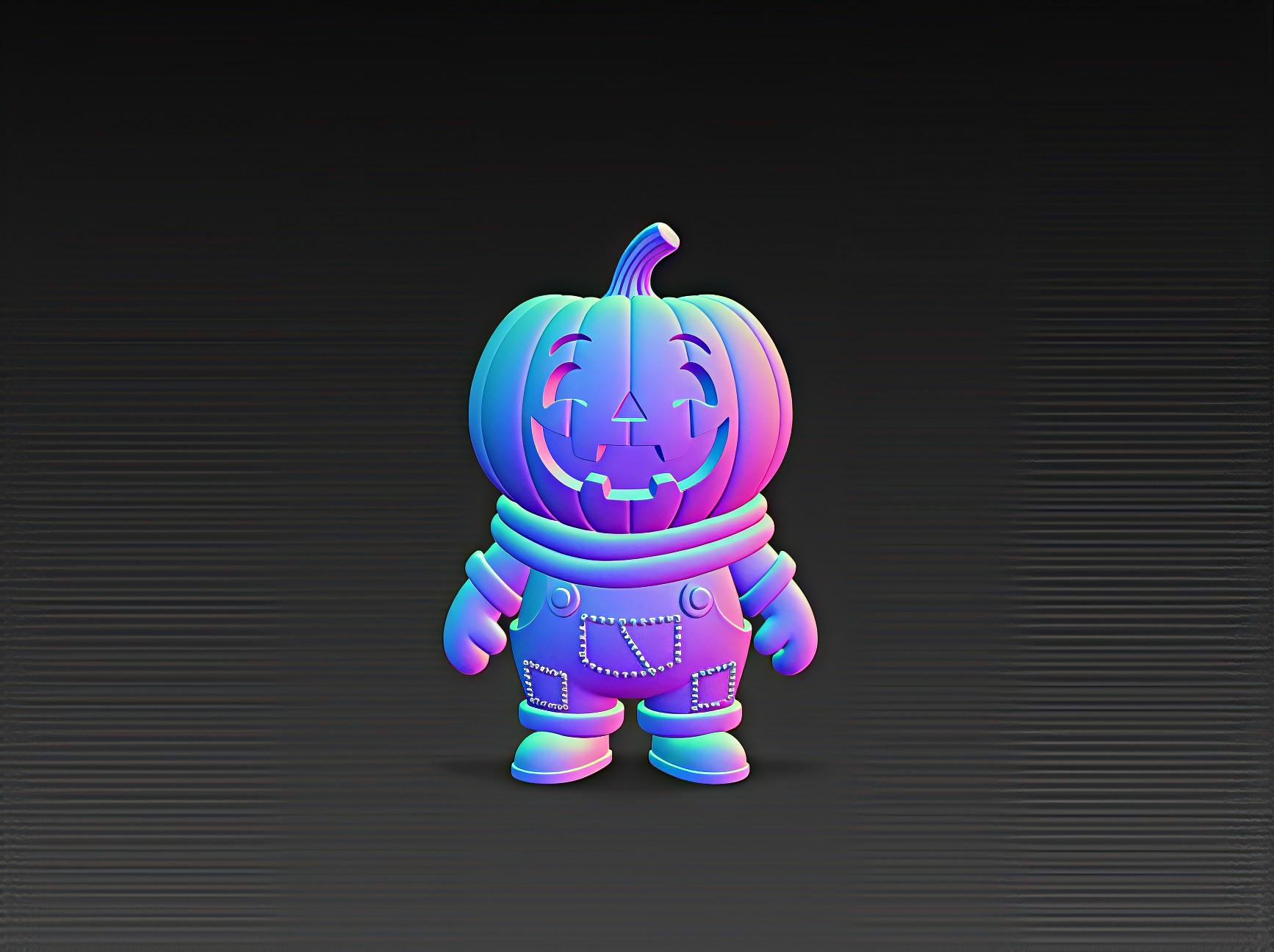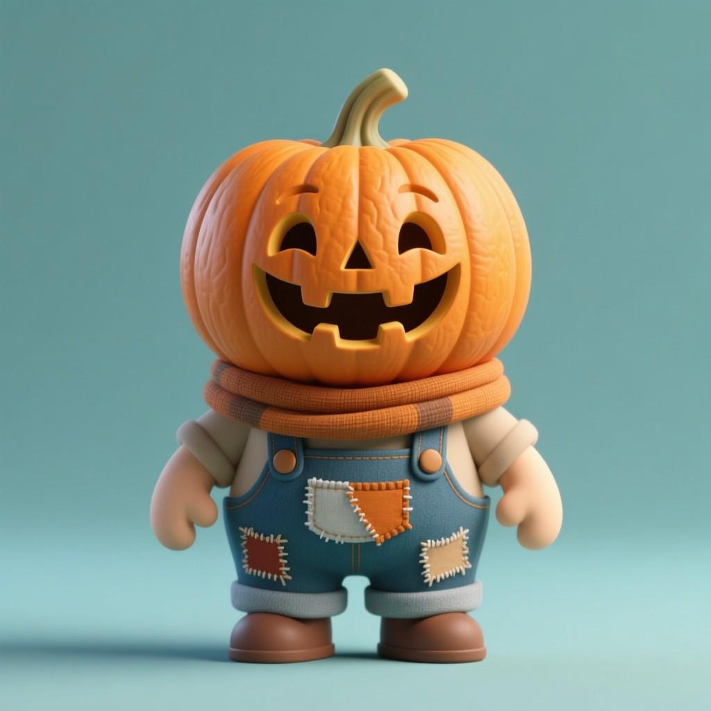 A cheerful jack-o’-lantern character with overalls and a cozy scarf — ideal as a desk toy, shelf decor, or gift.