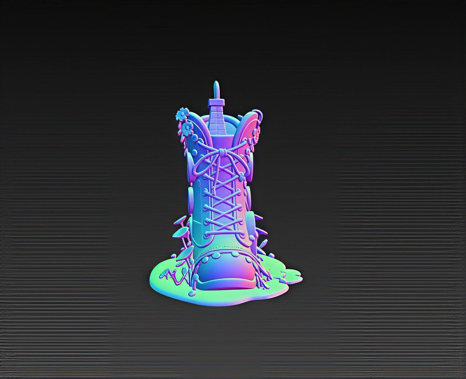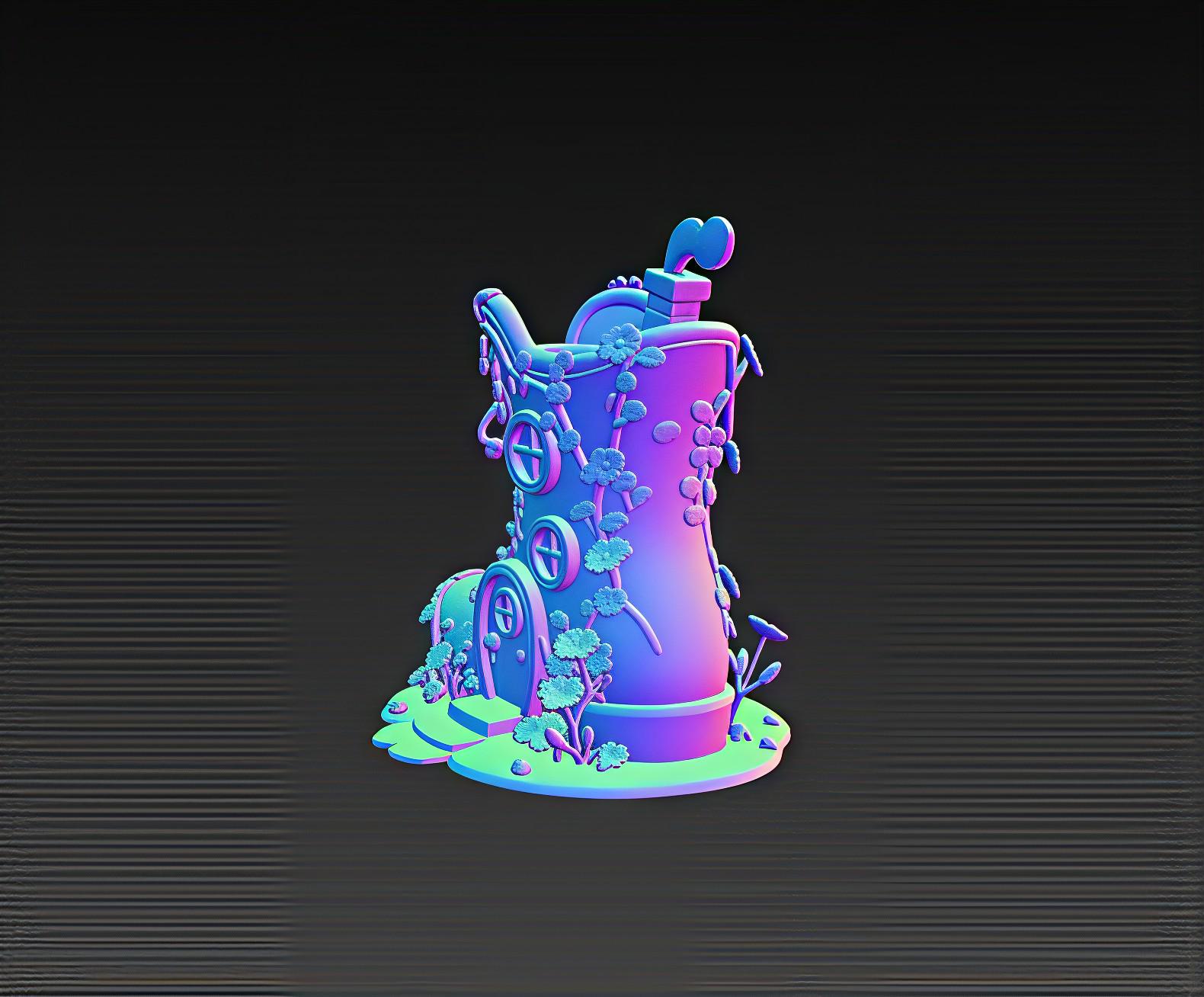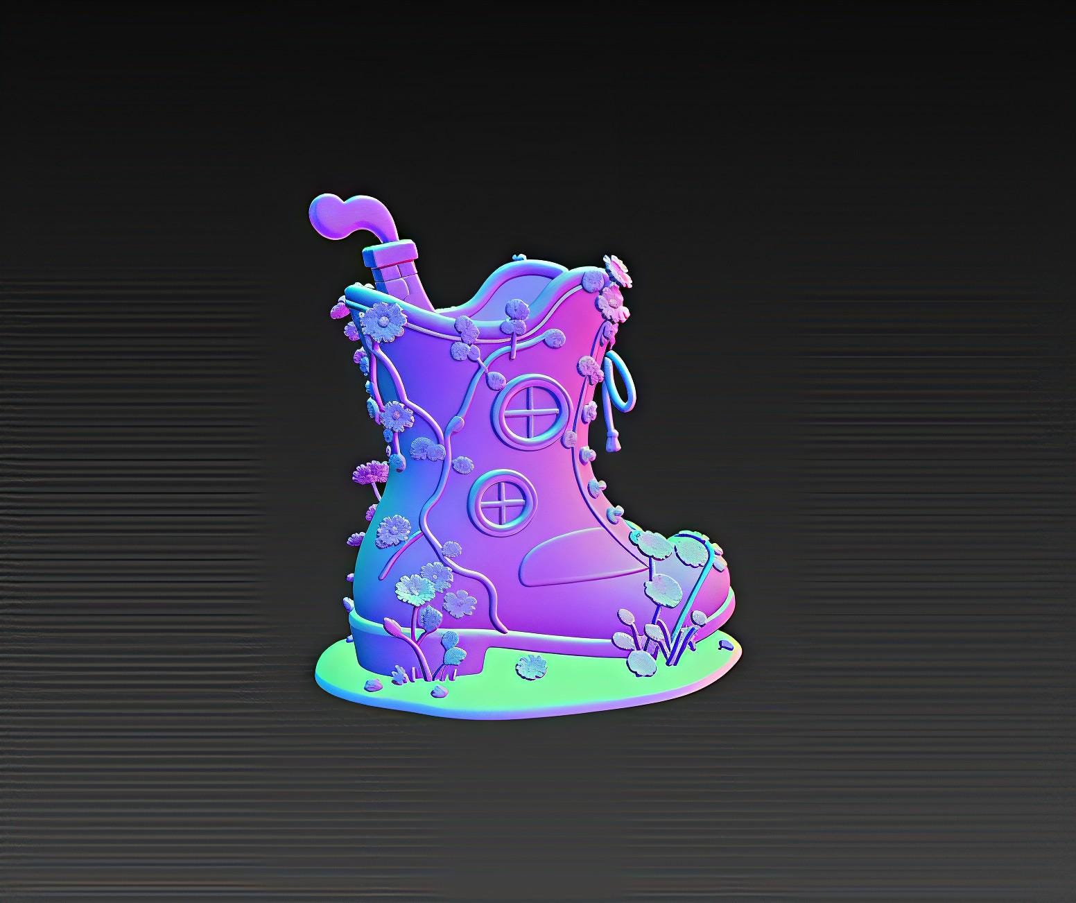 This detailed 3D printable model combines a vintage boot design with cozy cottage charm — featuring round windows, climbing vines, and floral accents.