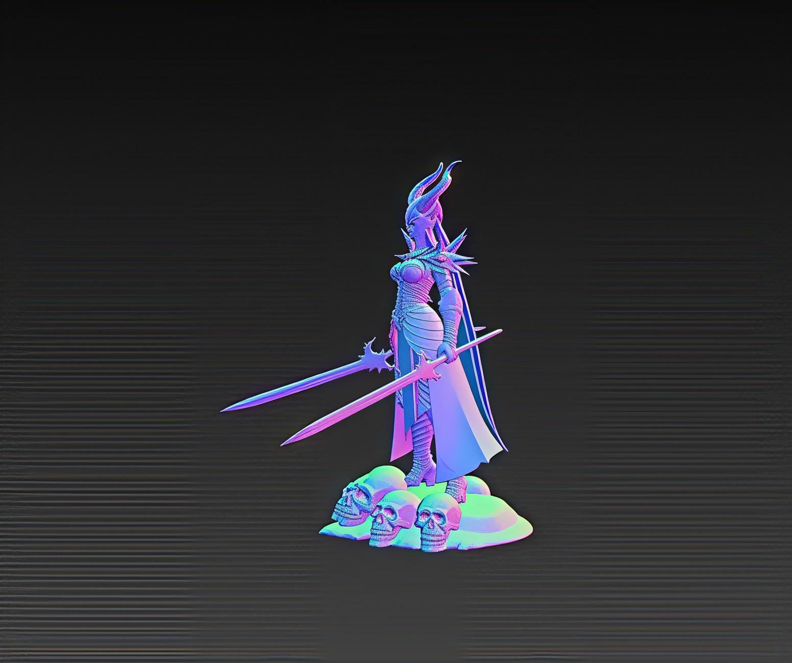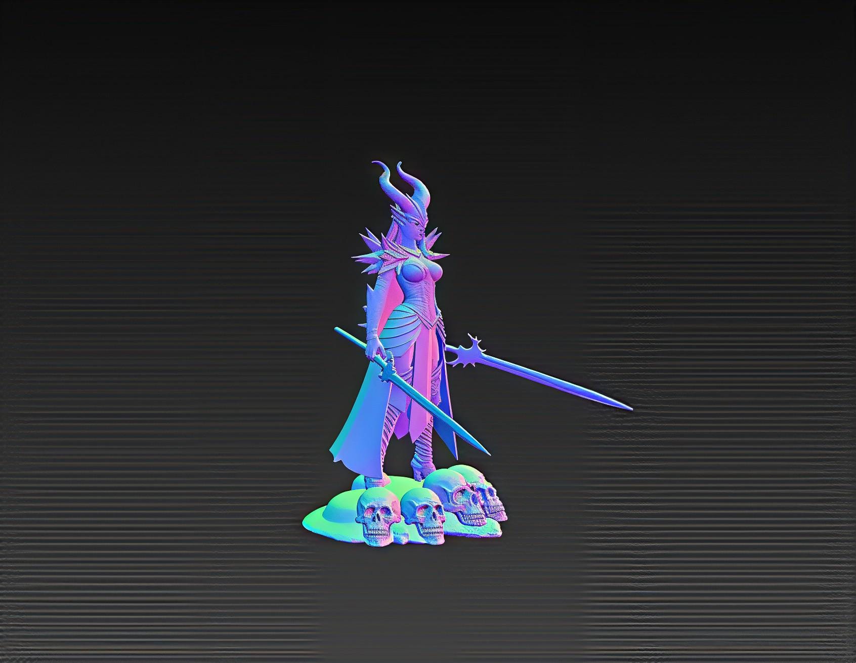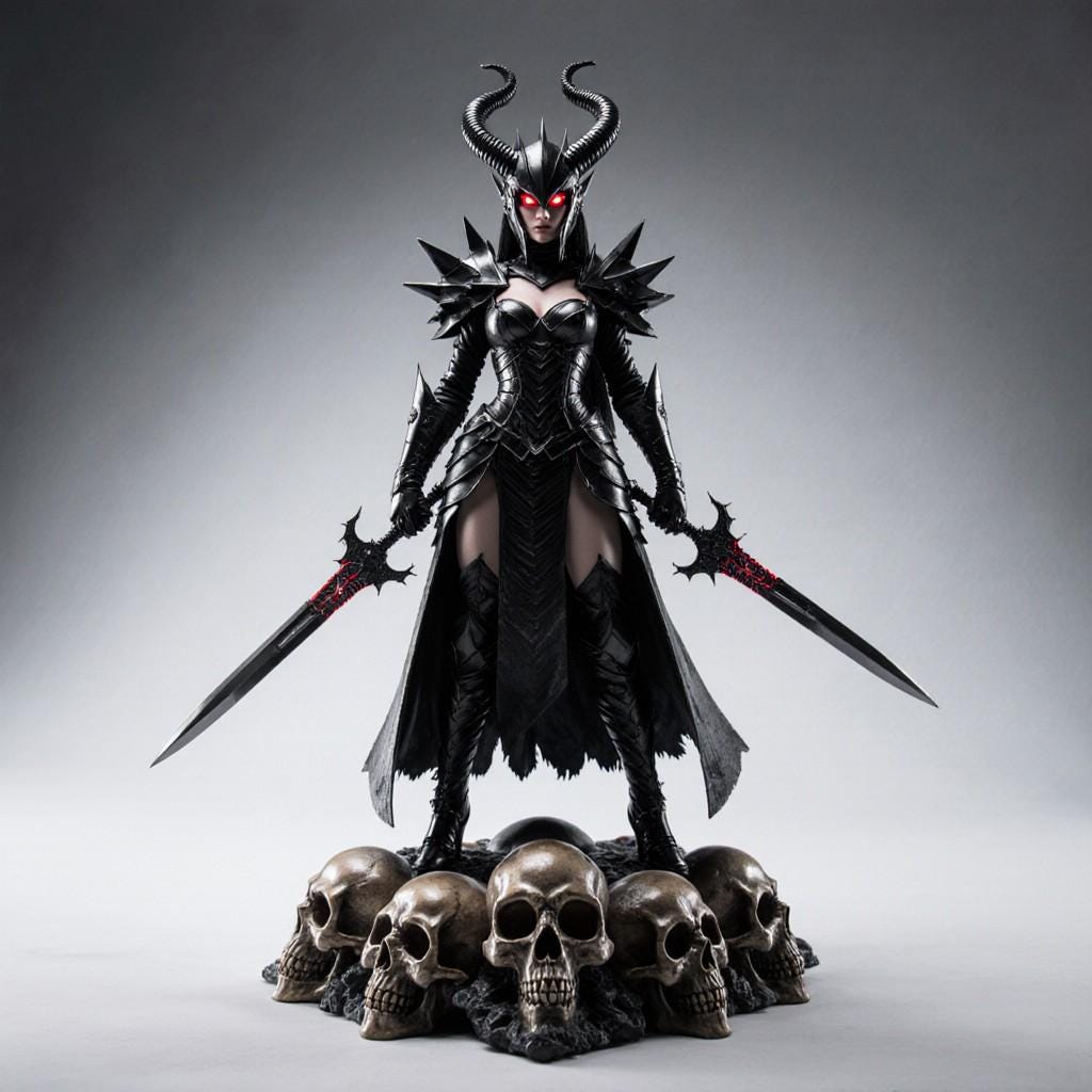 Command the darkness with this Dark Queen Warrior STL, a stunning 3D printable statue featuring gothic armor, twin blades, and a throne of skulls.