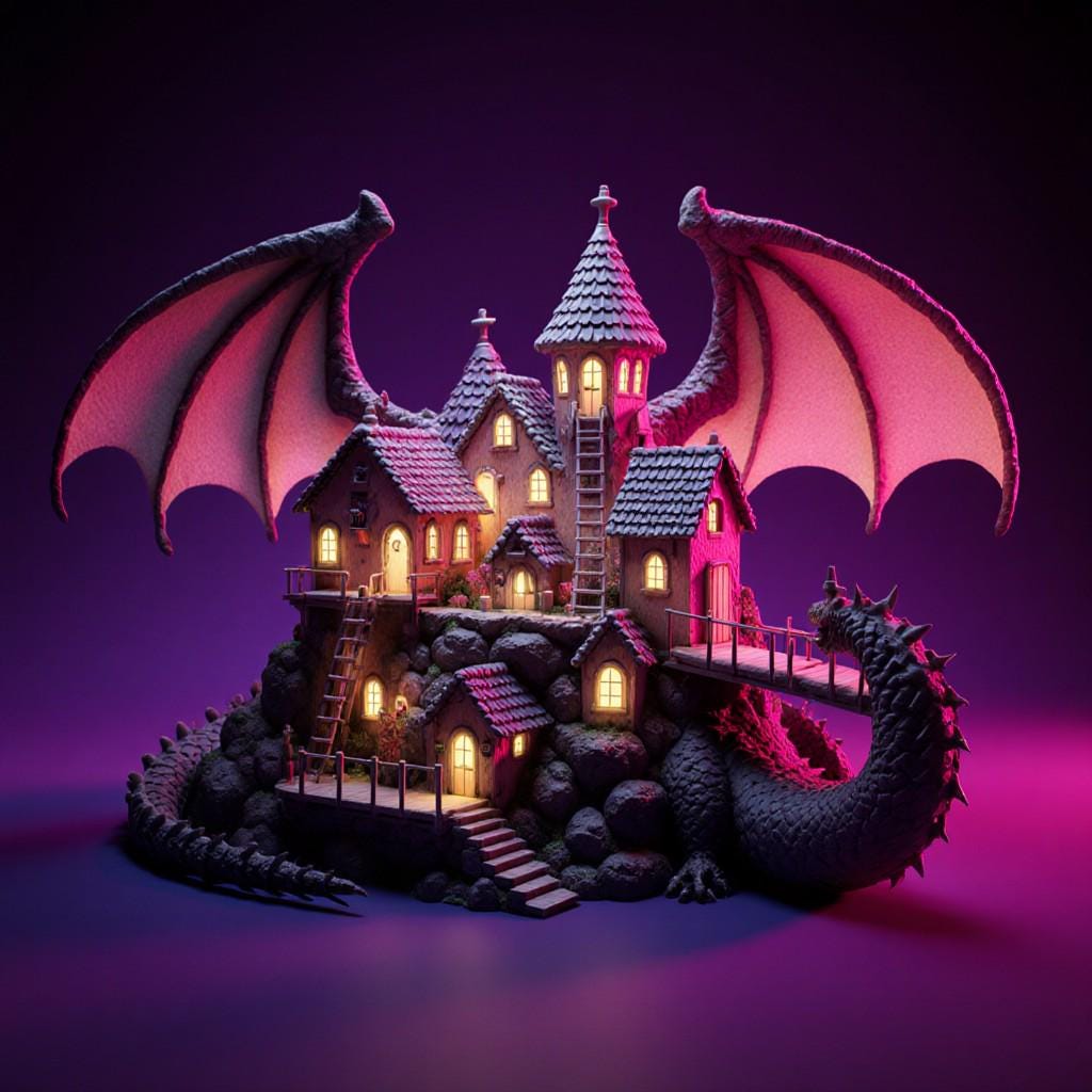 This Dragon Village STL is a detailed 3D printable fantasy diorama featuring a powerful dragon wrapped around glowing cottages.