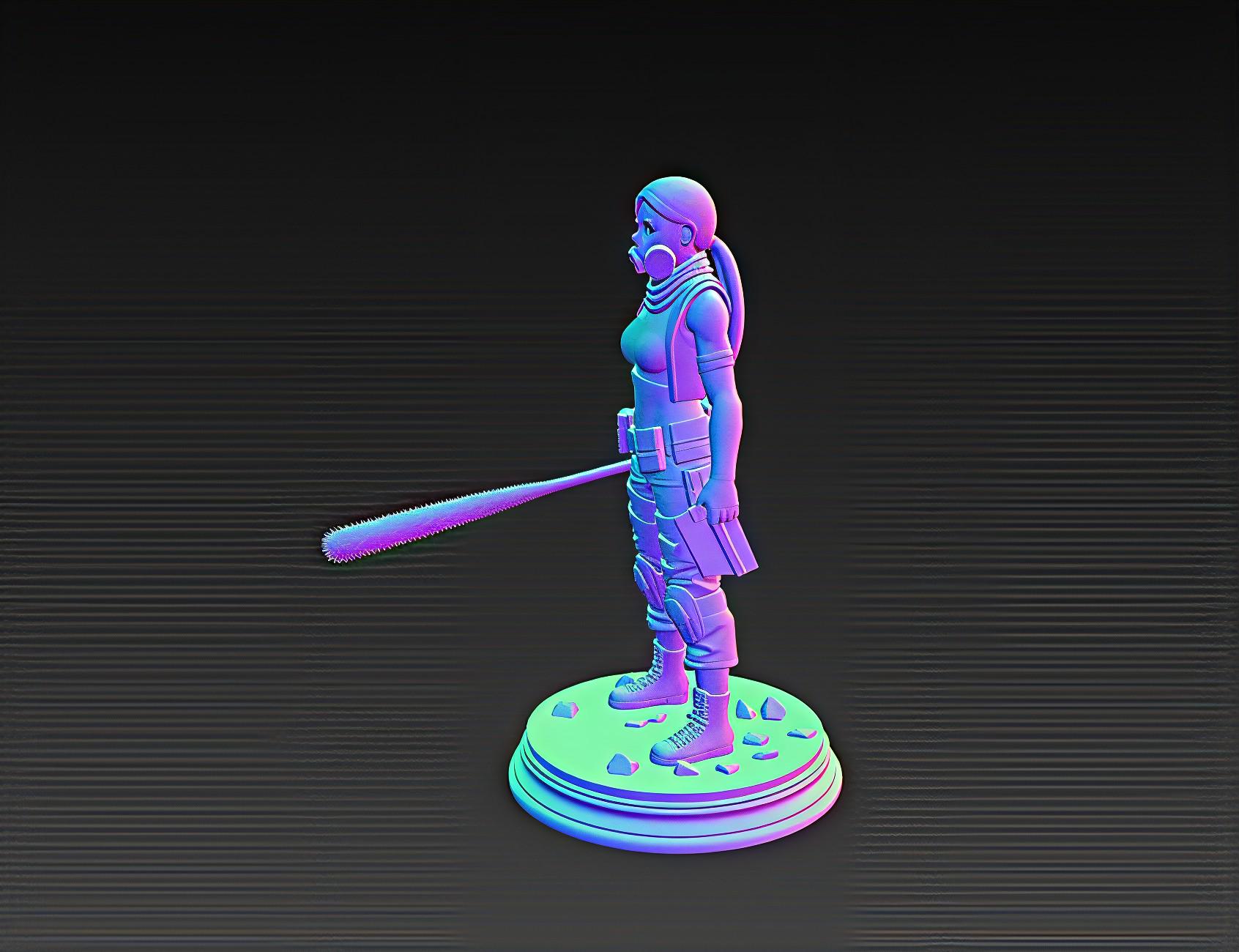 A powerful 3D printable model featuring a fearless fighter wearing a gas mask, wielding a spiked bat and a pistol — perfect for collectors, painters, and diorama creators.