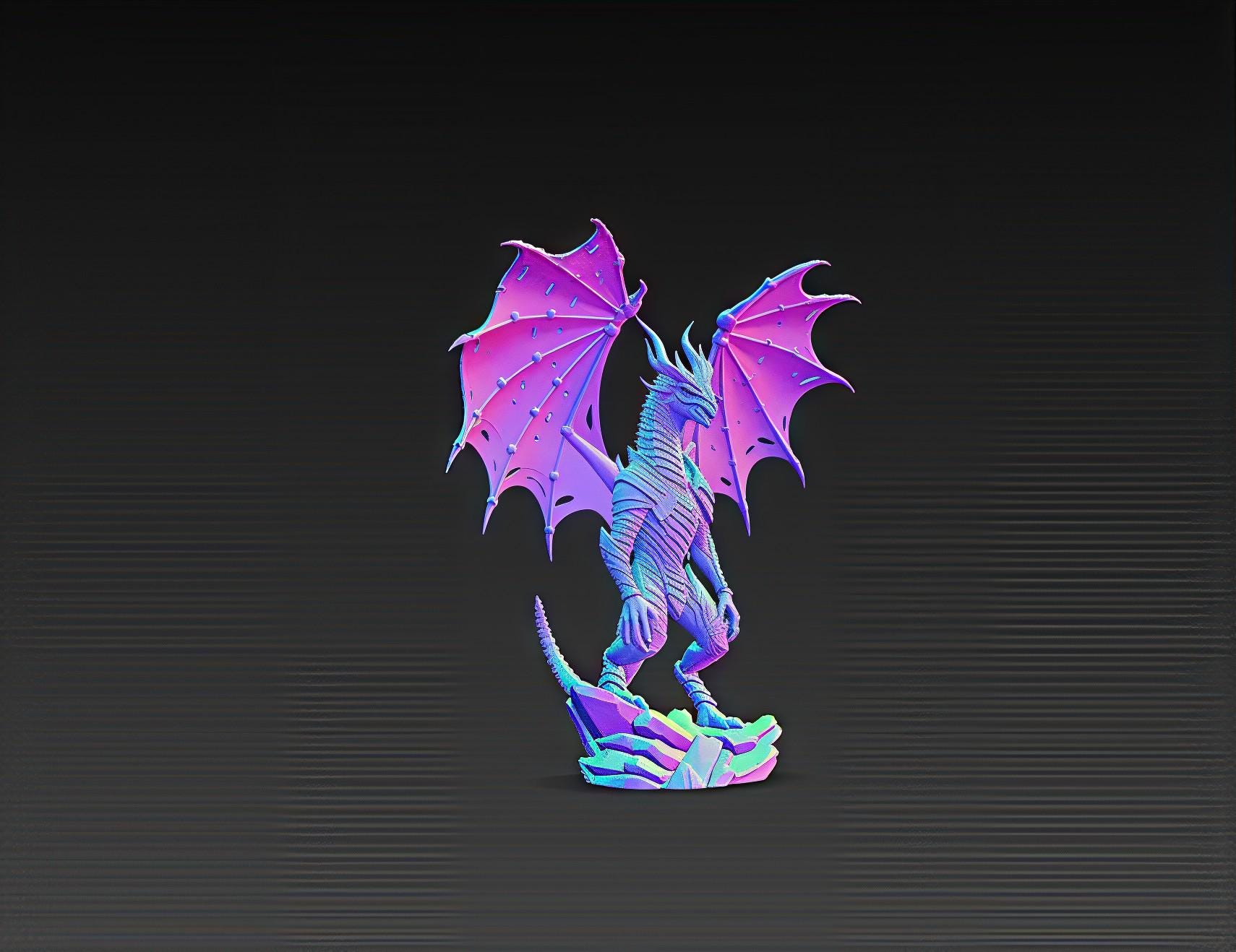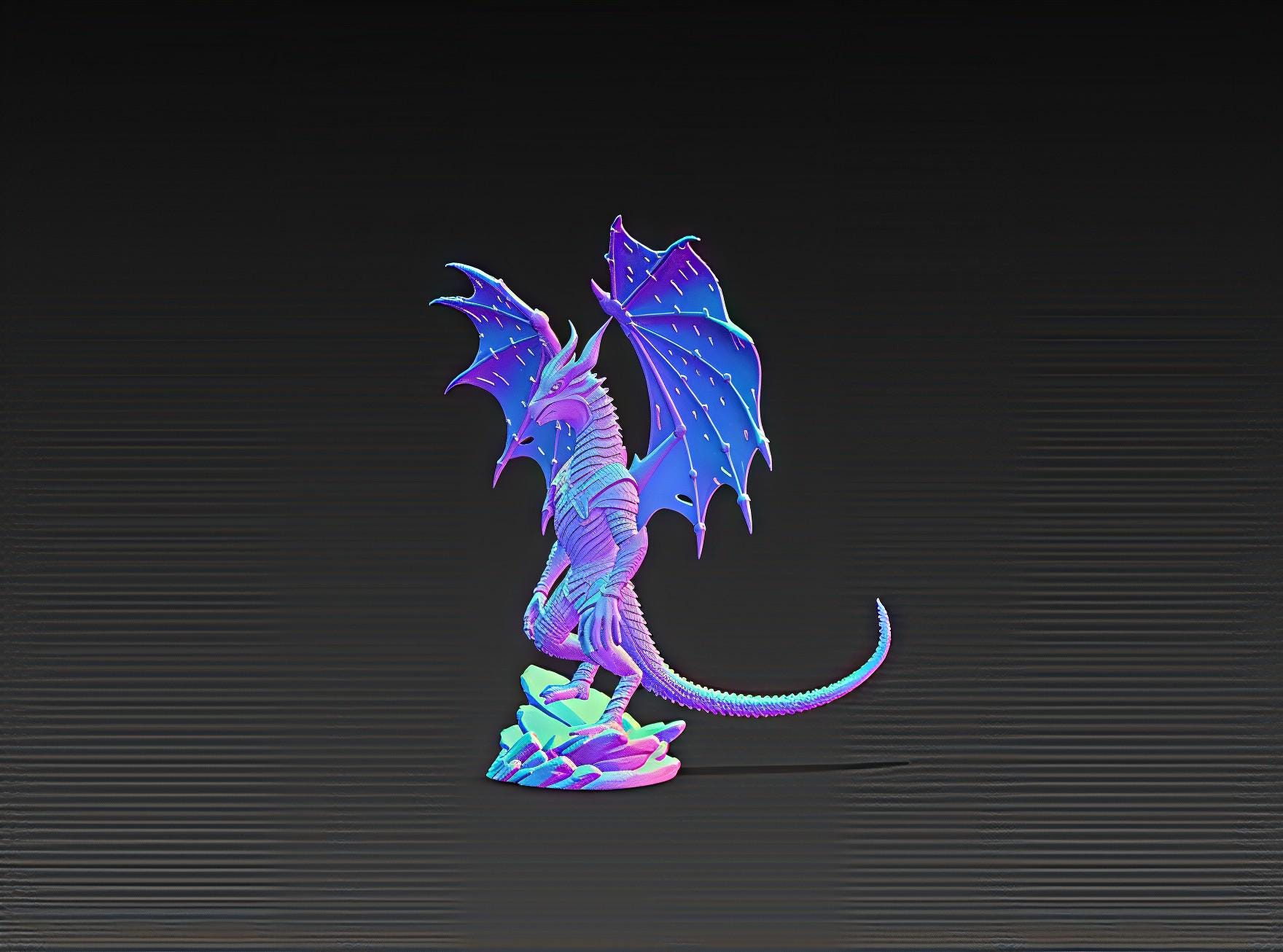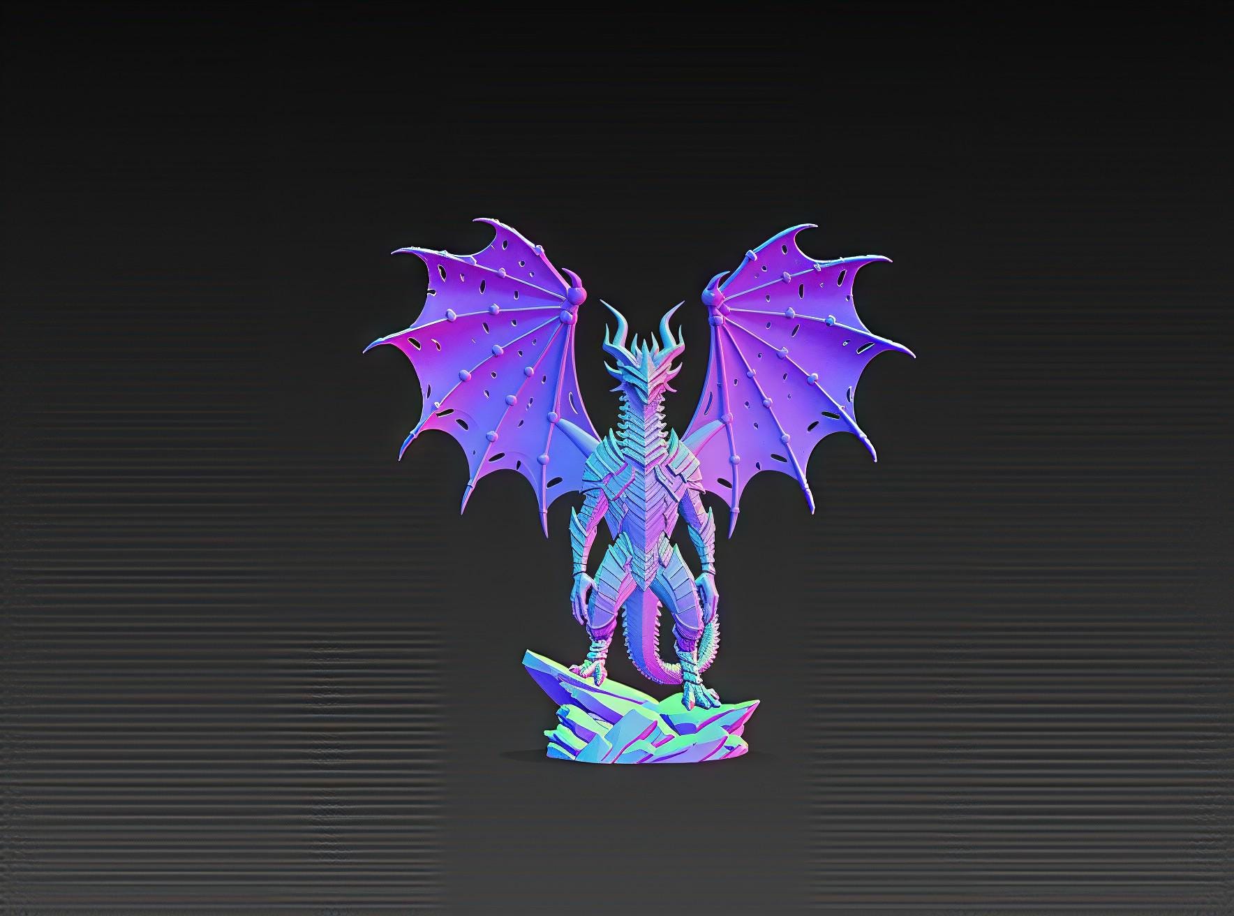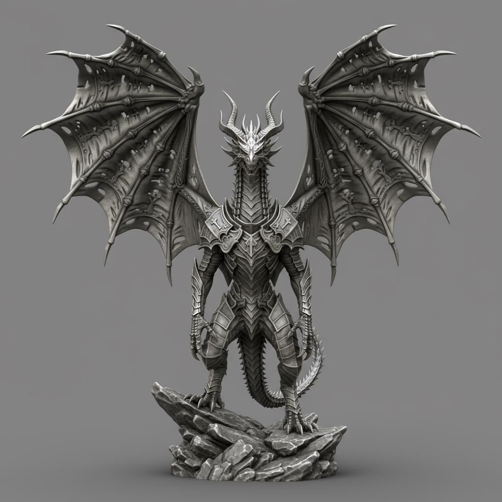 This highly detailed armored dragon STL features dramatic wings, layered plating, and a powerful warrior stance atop a rocky base.