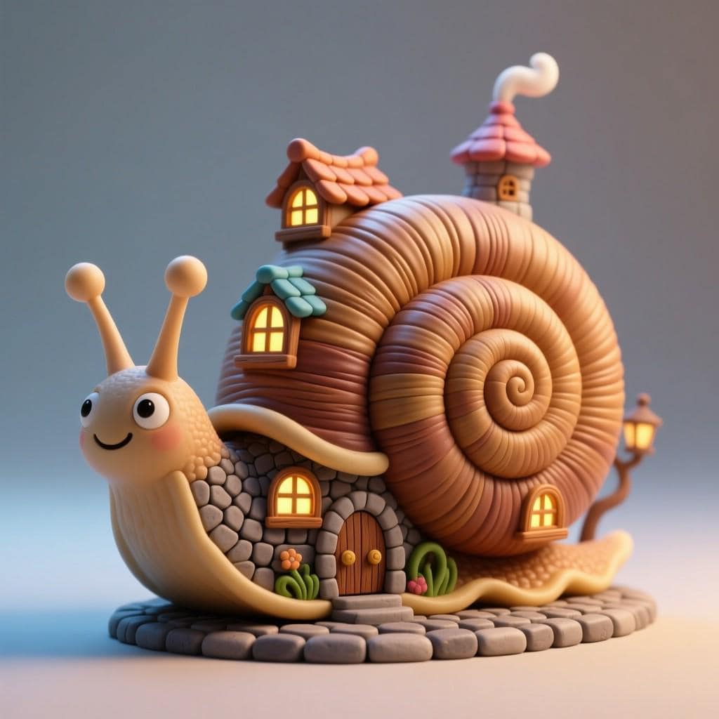 This adorable snail cottage STL blends a cheerful cartoon face with a detailed stone house and warm glowing windows for a magical cottagecore charm.