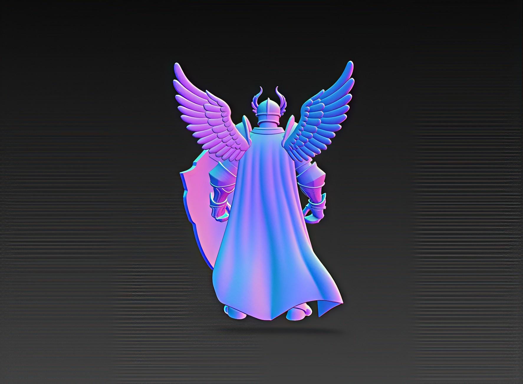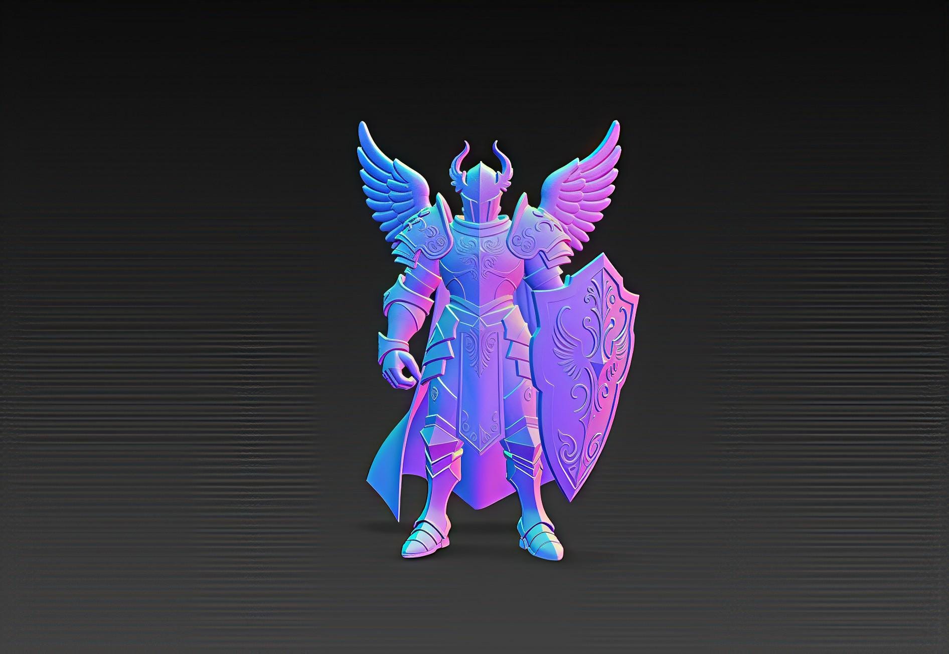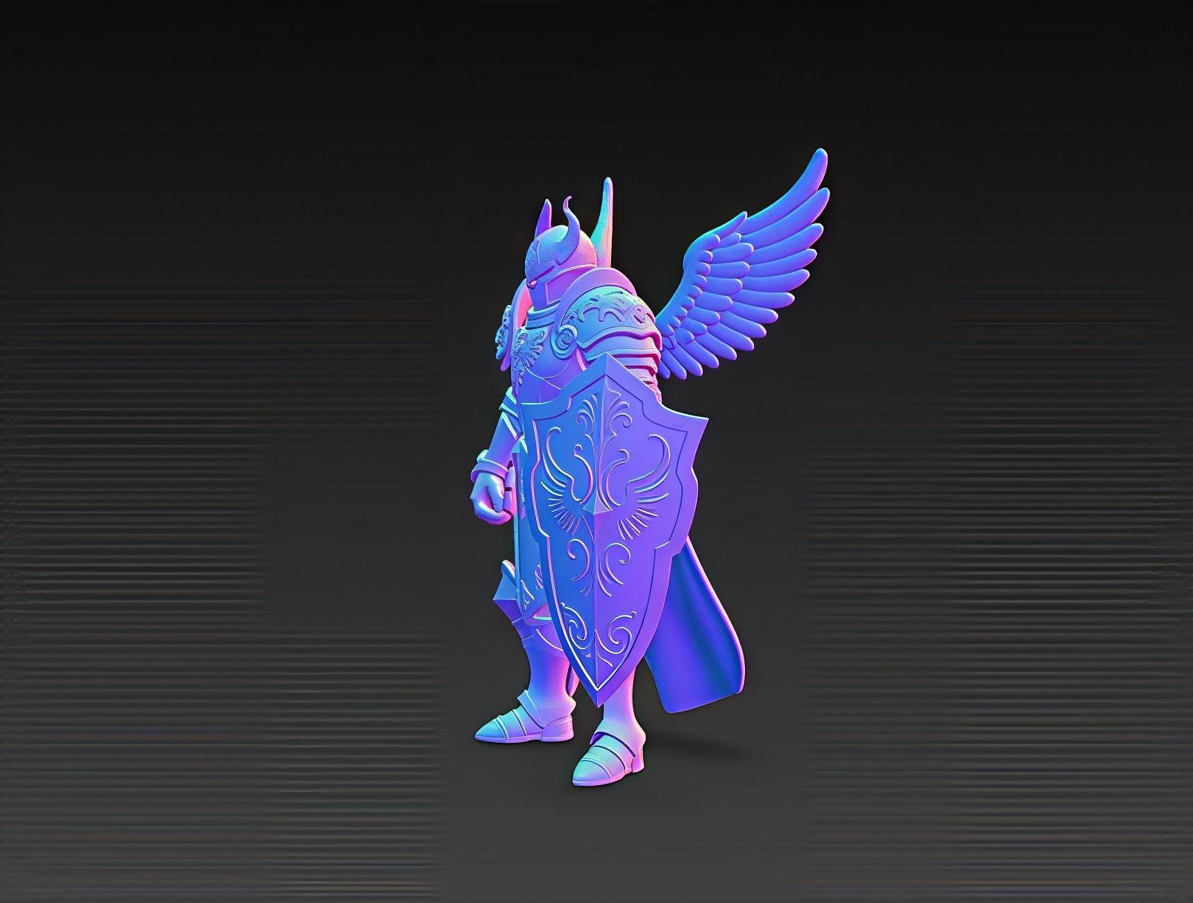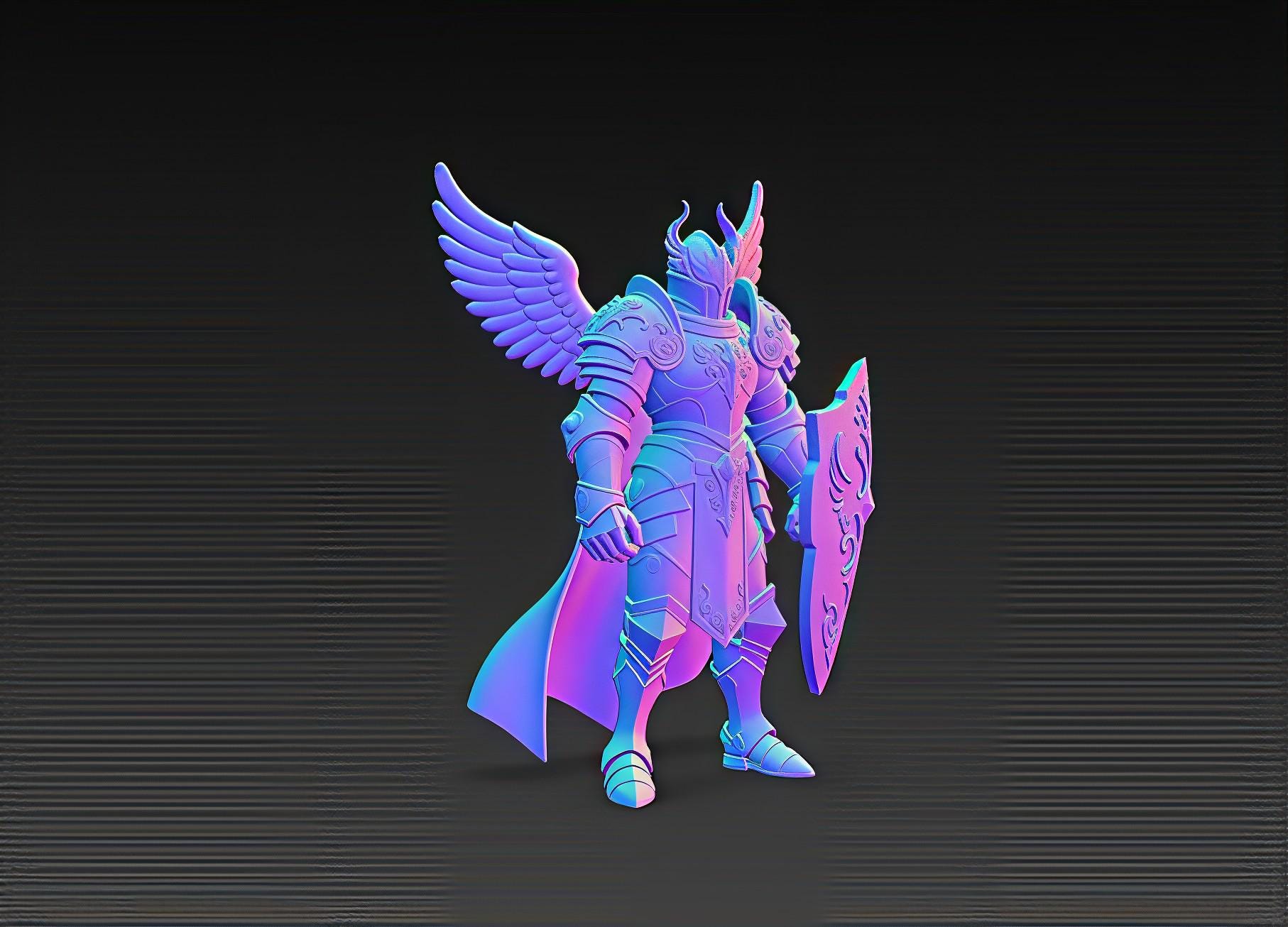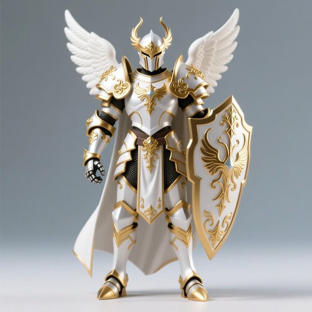 This angelic paladin knight STL features ornate gold-trimmed armor, majestic wings, and a detailed shield for a powerful high-fantasy aesthetic.