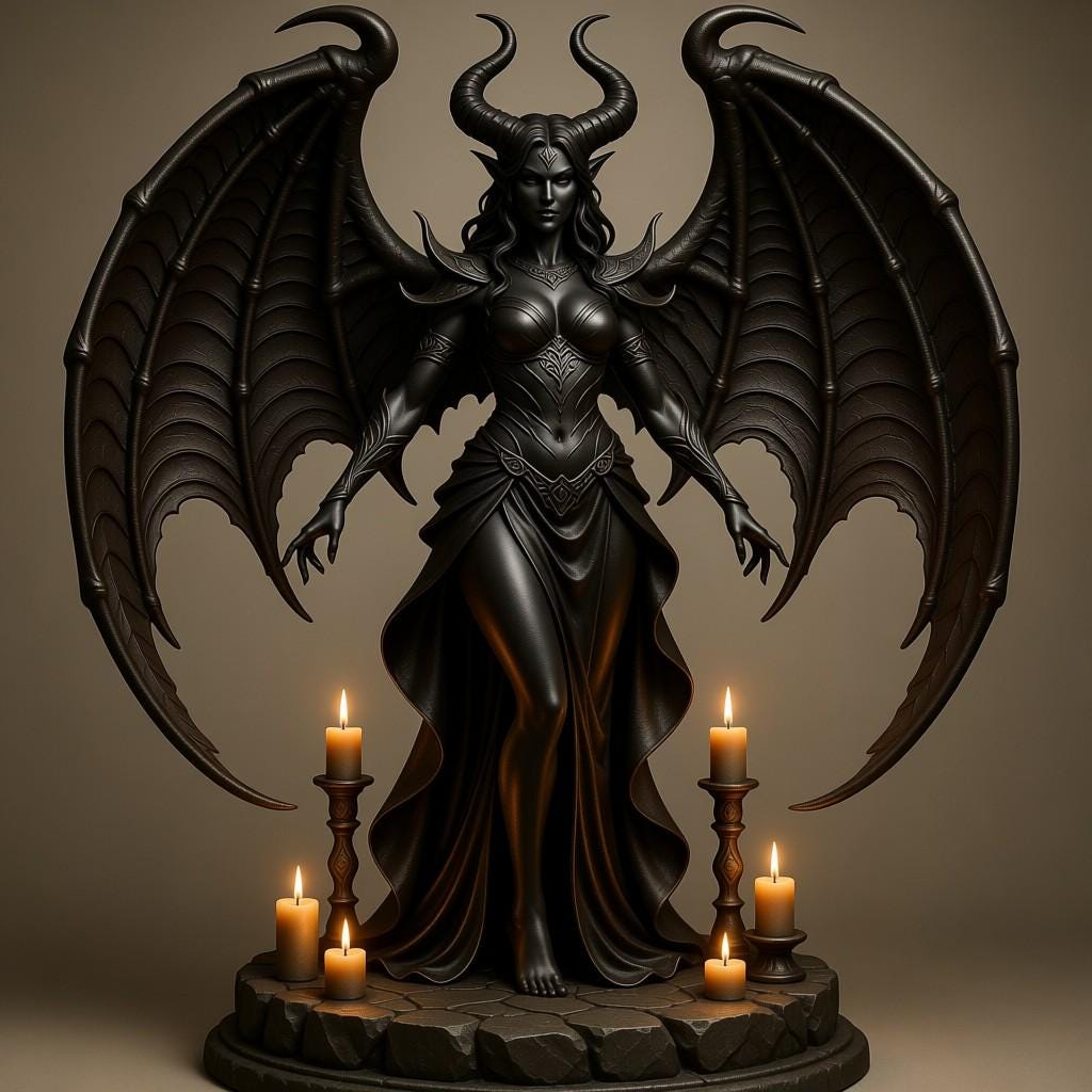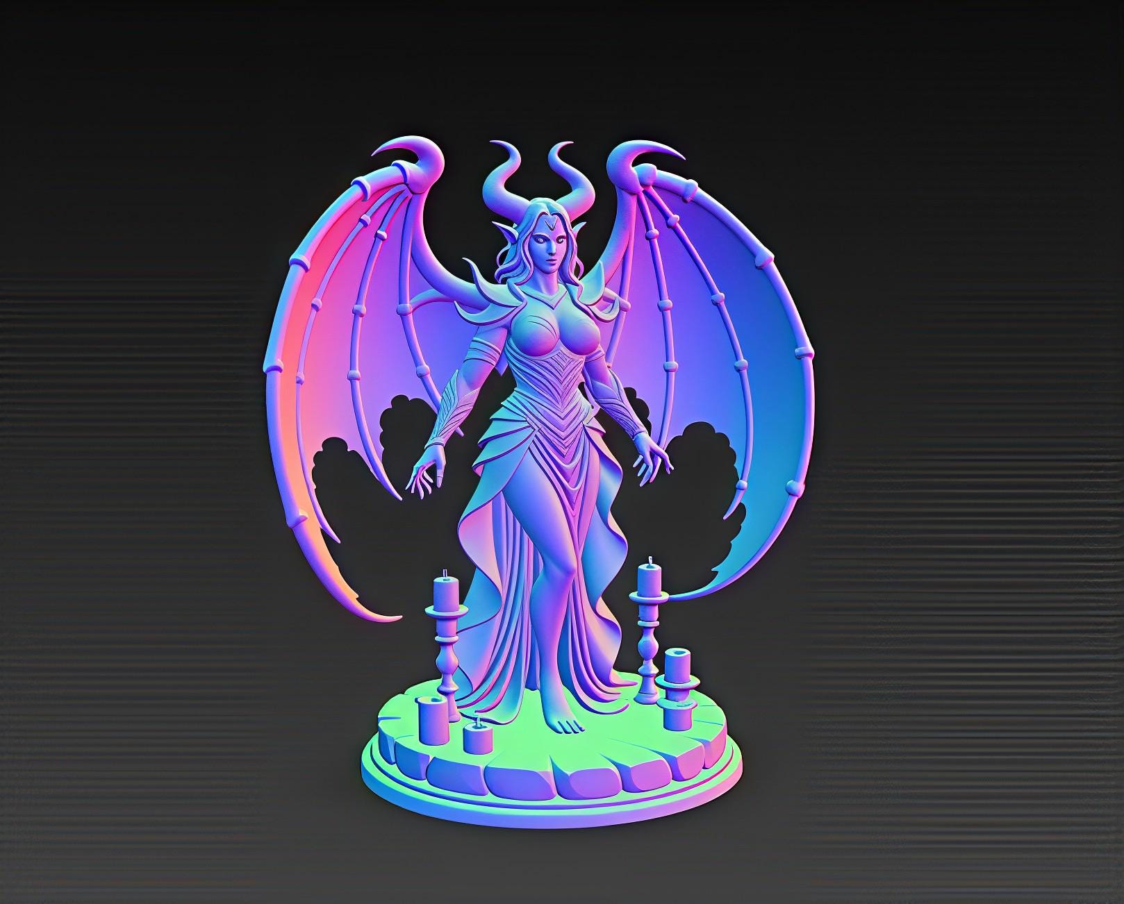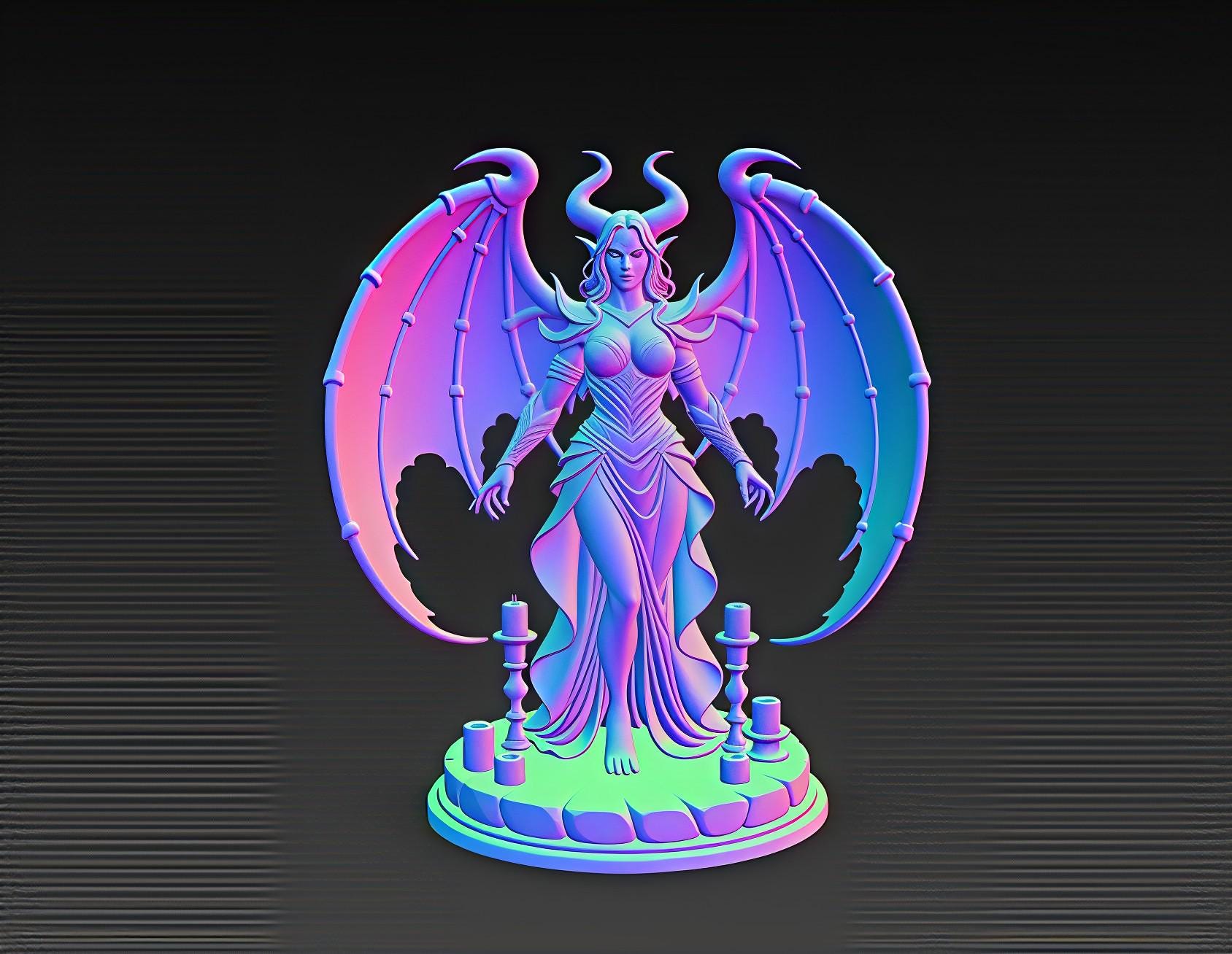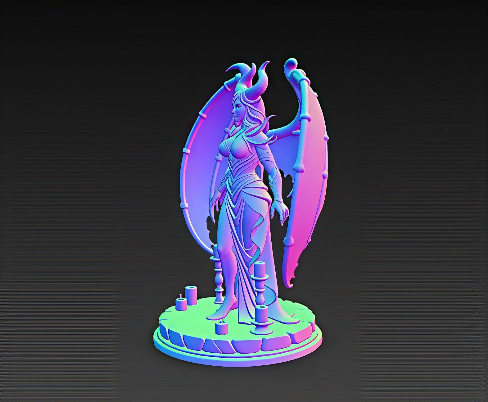 This winged demon goddess STL features dramatic horns, intricate armor, and a flowing sculpted dress. The detailed wings and candle-lit base print beautifully on both resin and FDM machines, creating a premium gothic display piece. Ideal for fantasy collectors and dark décor setups. Digital download only.