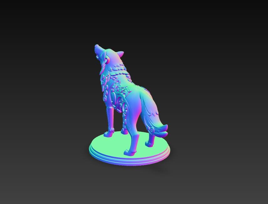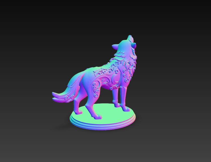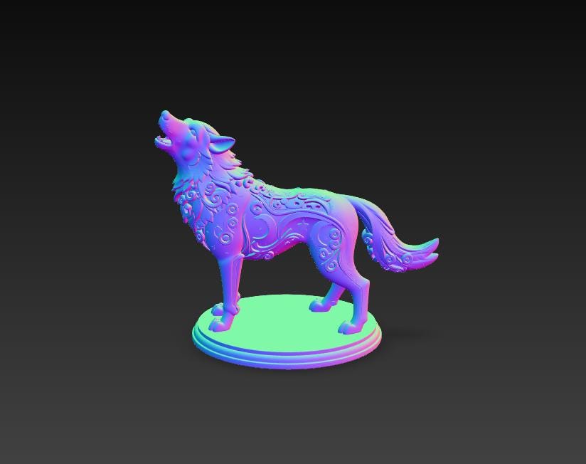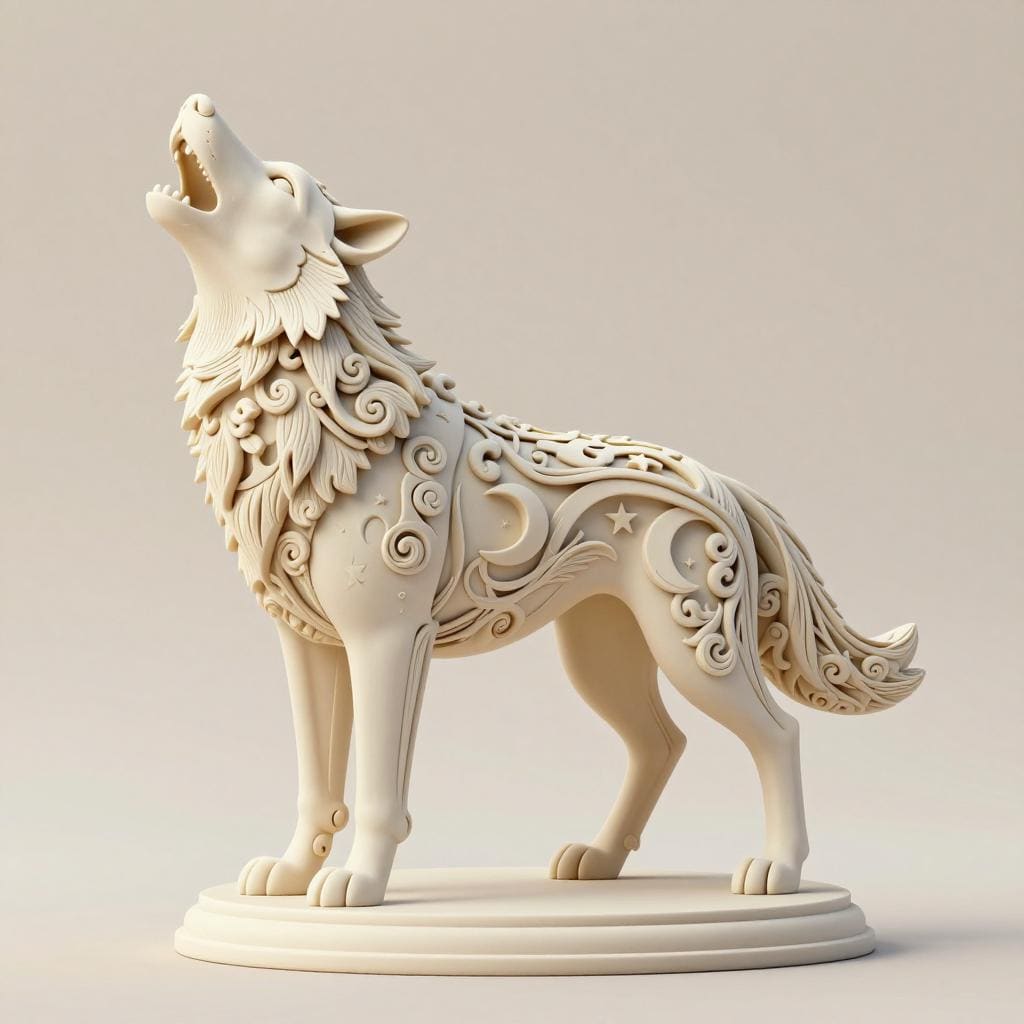 Digital STL download for a highly detailed howling wolf figurine with moon-and-stars ornament—perfect for fantasy home decor, gothic shelf display, and collector desk decor. Single-piece, one-color model for easy 3D printing.