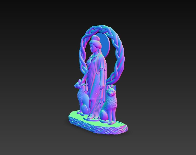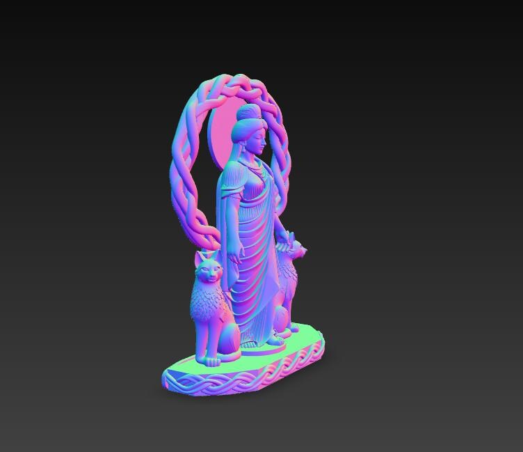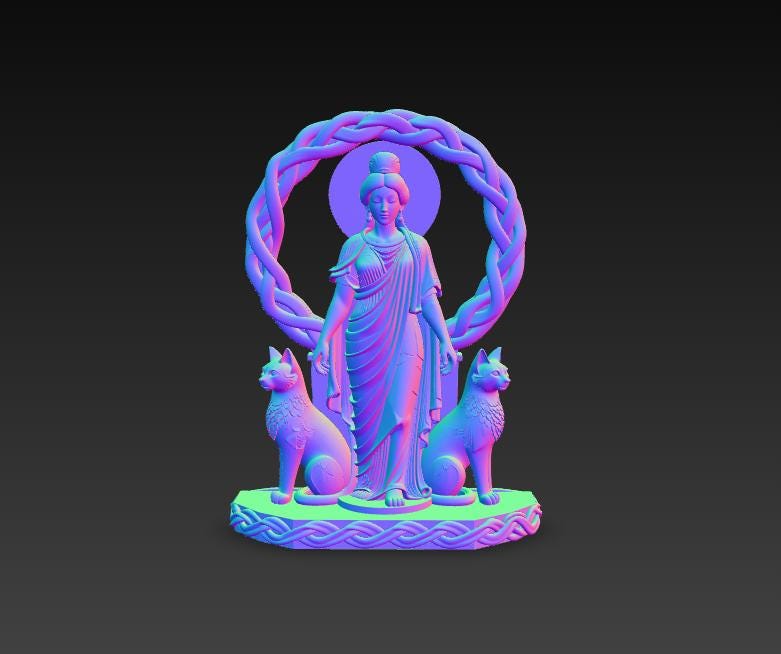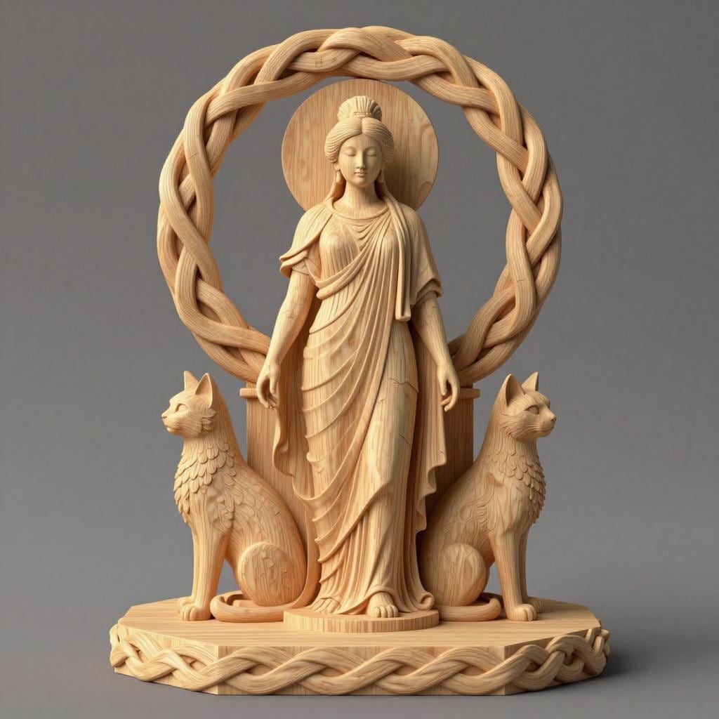 Digital STL download for a highly detailed goddess statue with twin cats and braided halo—perfect for witchy altar decor, Celtic-inspired home decor, and collector shelf display. Single-piece, one-color model for easy 3D printing.