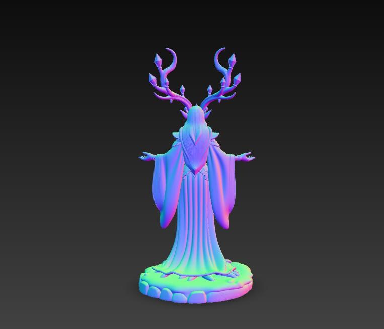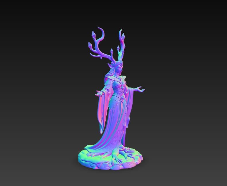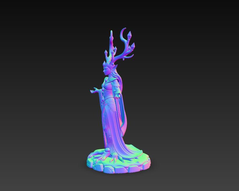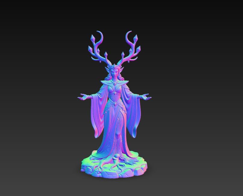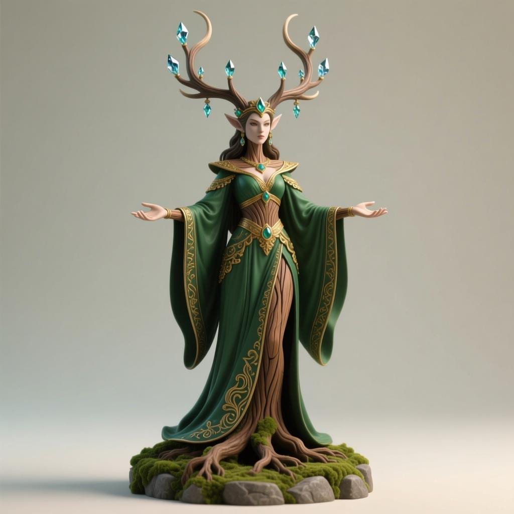 Digital STL download for a detailed elven forest queen sorceress statue—perfect for fantasy RPG tabletop display, mystical home decor, and collector shelf centerpiece. Single-piece, one-color model for easy 3D printing.