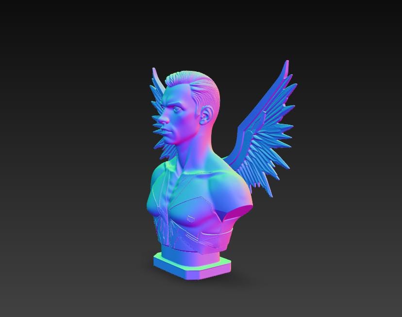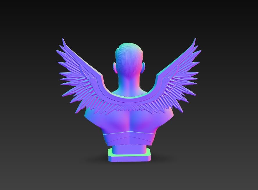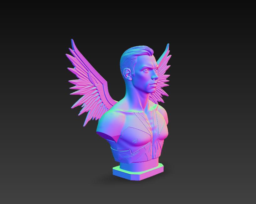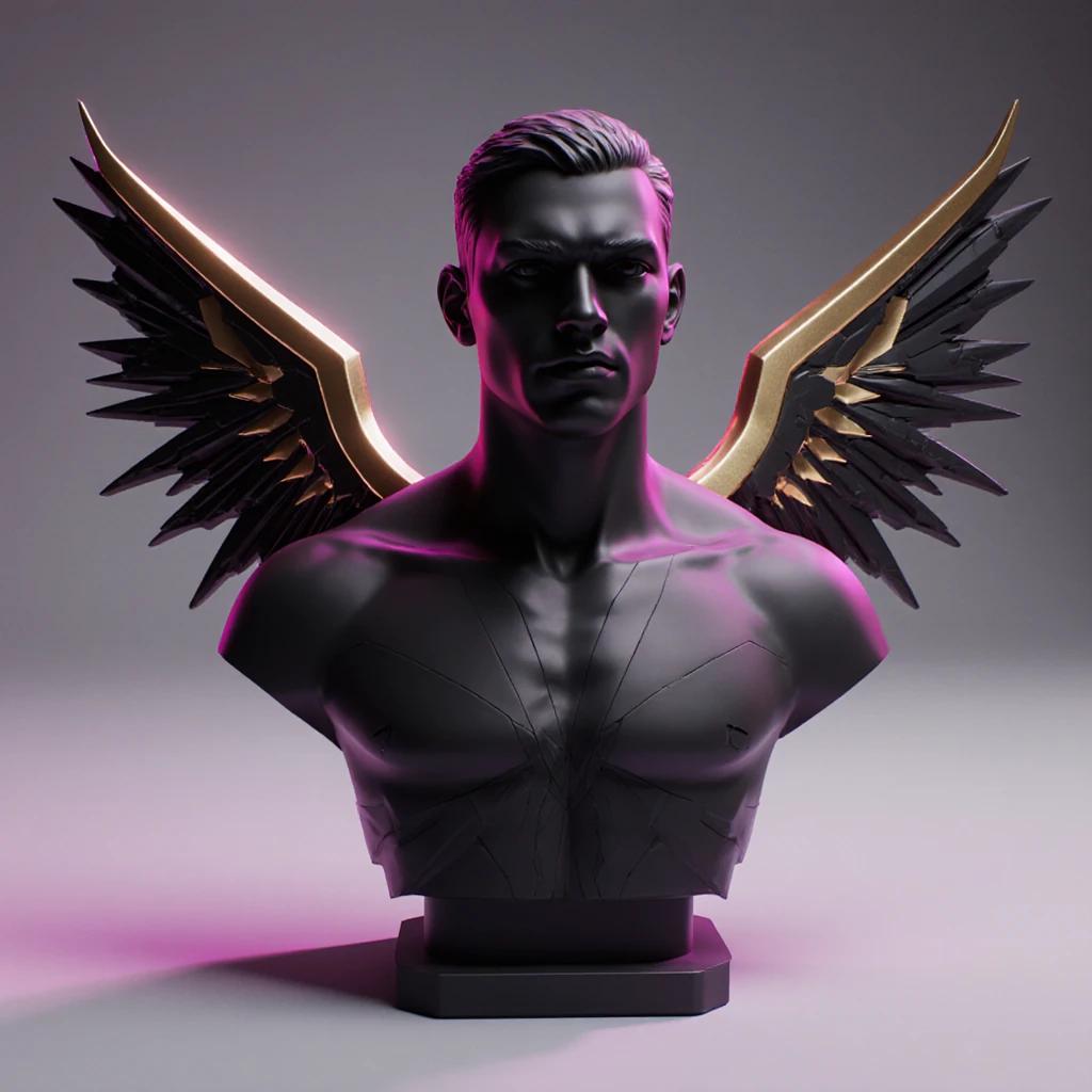 Digital STL download for a bold winged male bust—perfect for dark angel decor, modern fantasy display, and collector desk or shelf styling. Single-piece, one-color model for easy 3D printing.