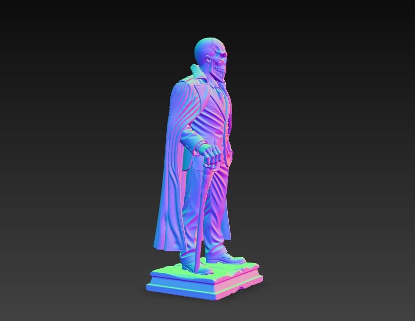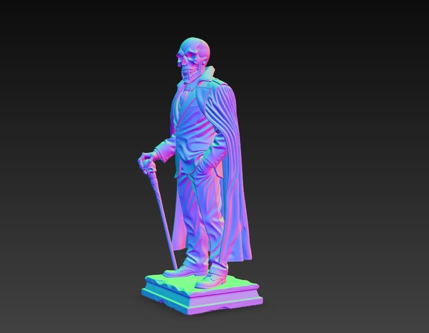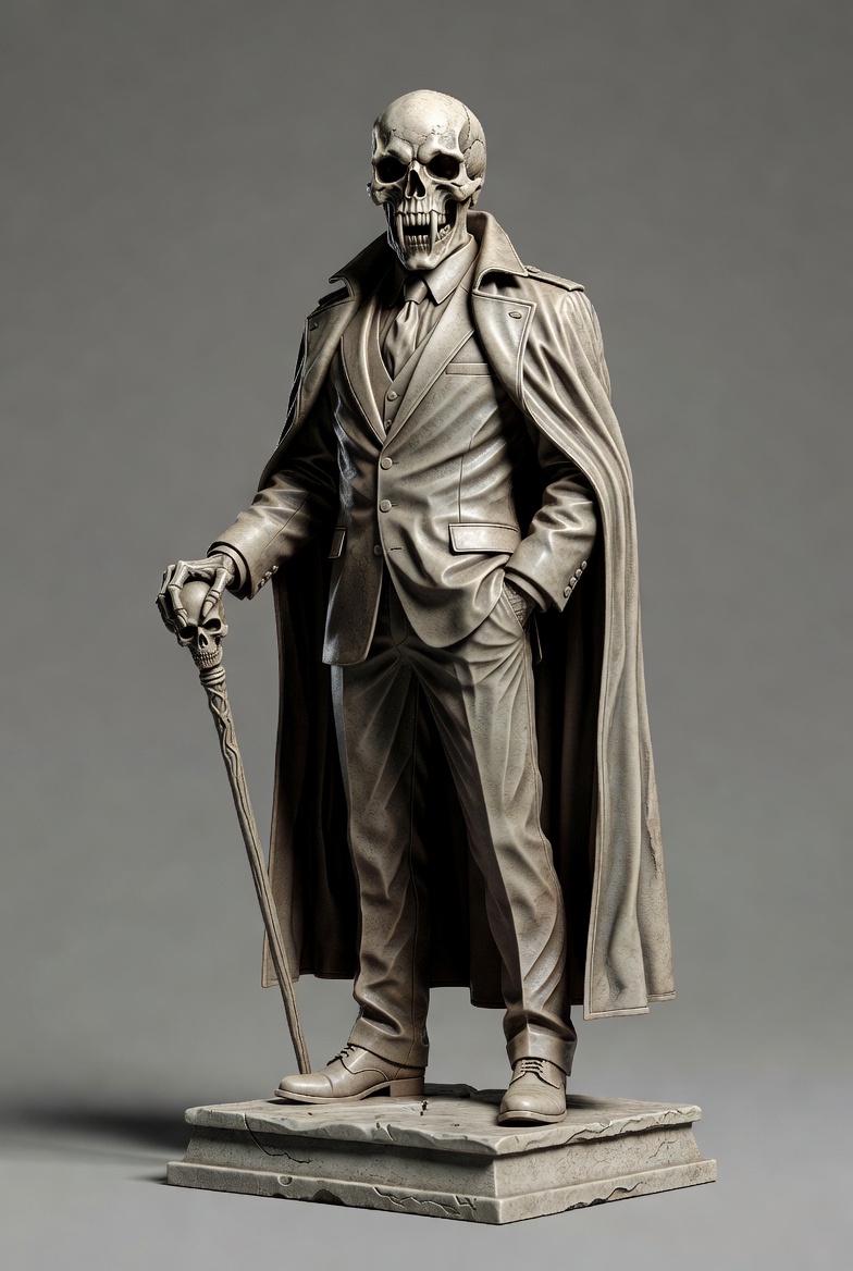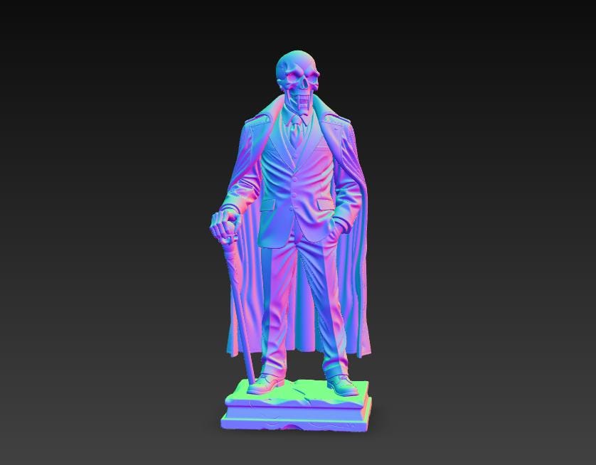 Highly detailed skeleton gentleman STL file featuring a skull-headed figure in an elegant suit with a cane and long coat. Perfect for gothic decor, collectors, and dark fantasy display pieces. The model is designed as a single-piece print and optimized for single-color 3D printing, making it easy to print on most FDM or resin 3D printers.