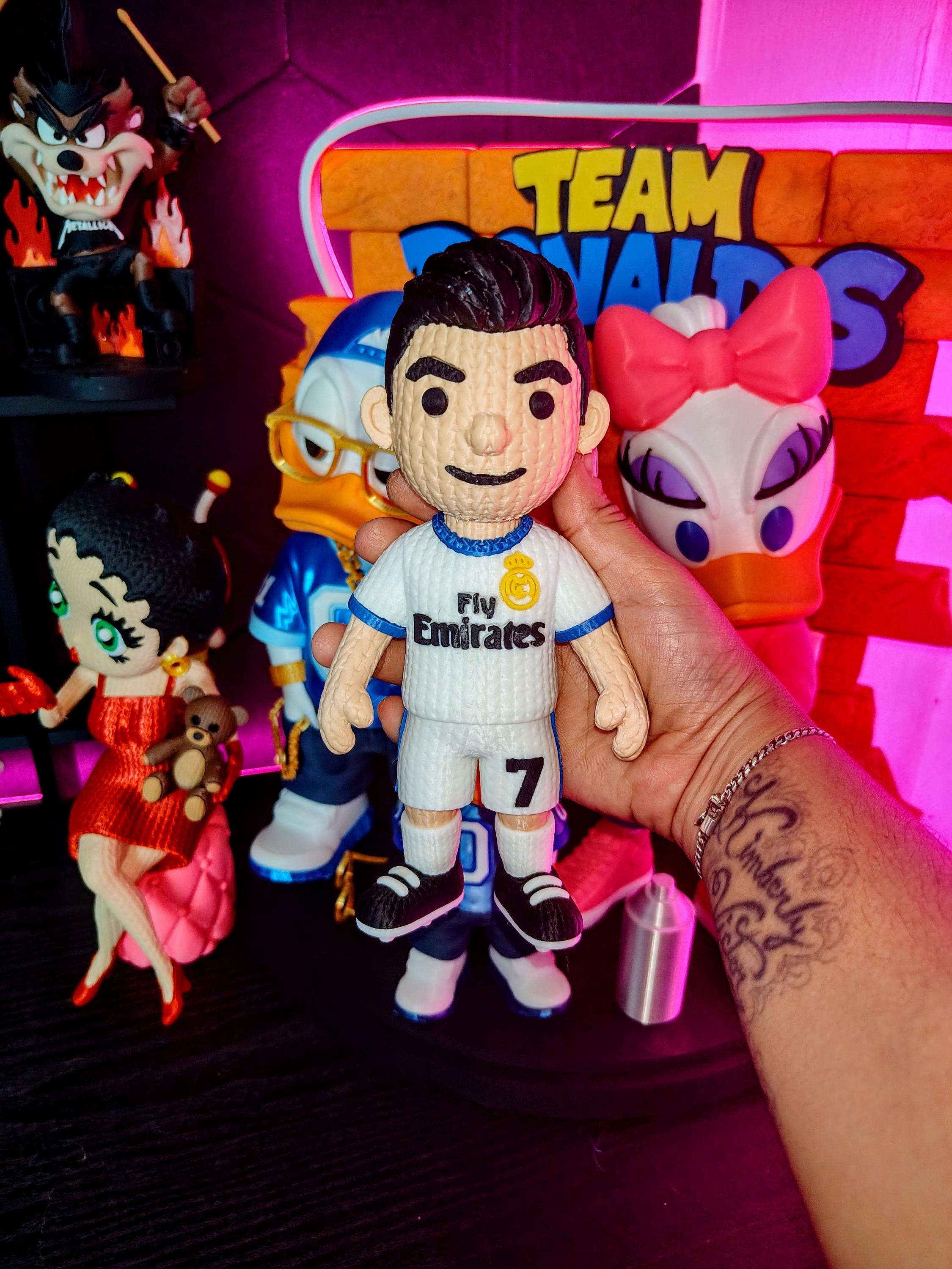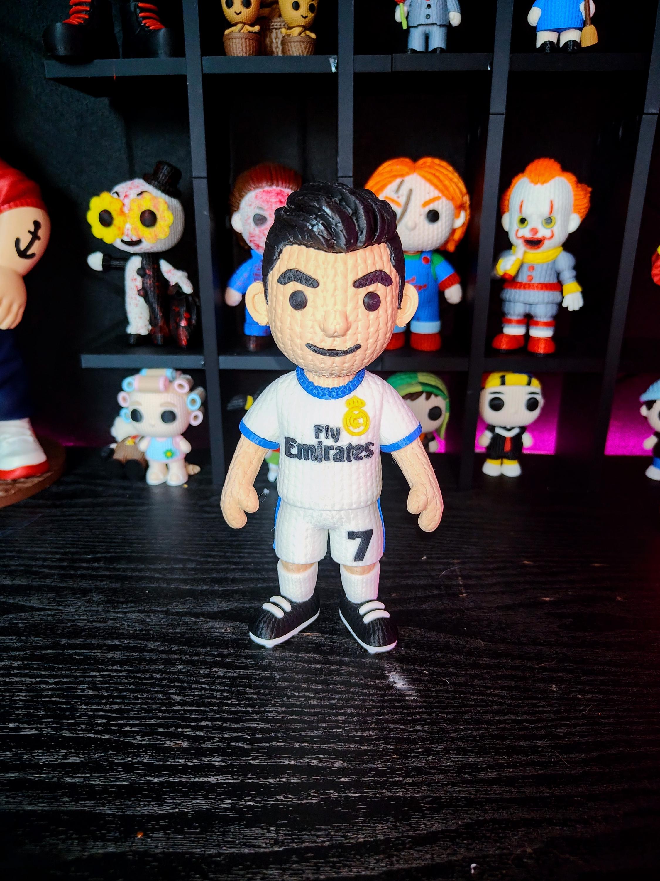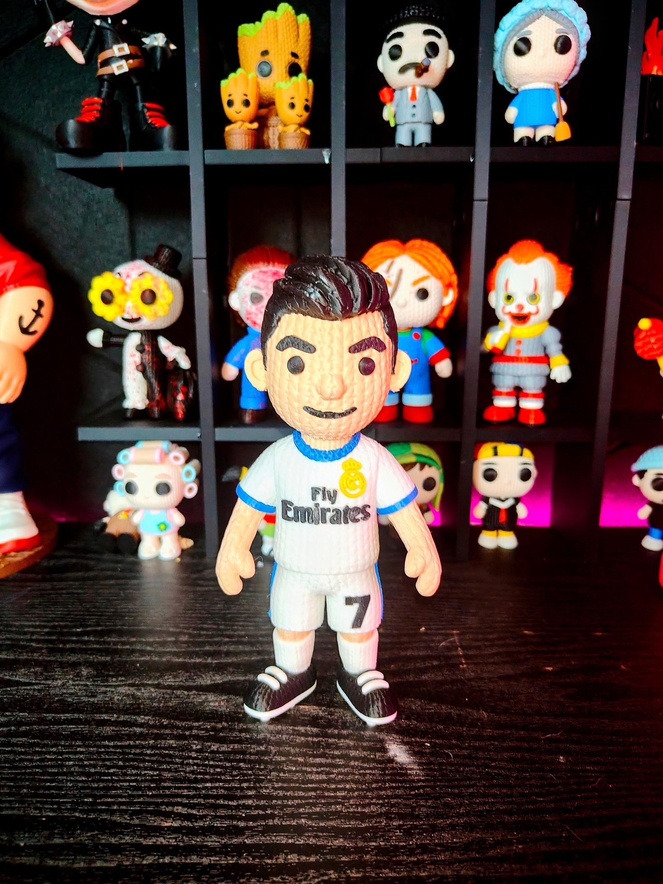 Bring the energy of a legendary football icon to your collection with this knitted-style soccer player figure. Designed with a unique textured look and detailed uniform, this 3D printed statue is perfect for fans of iconic number 7 players.