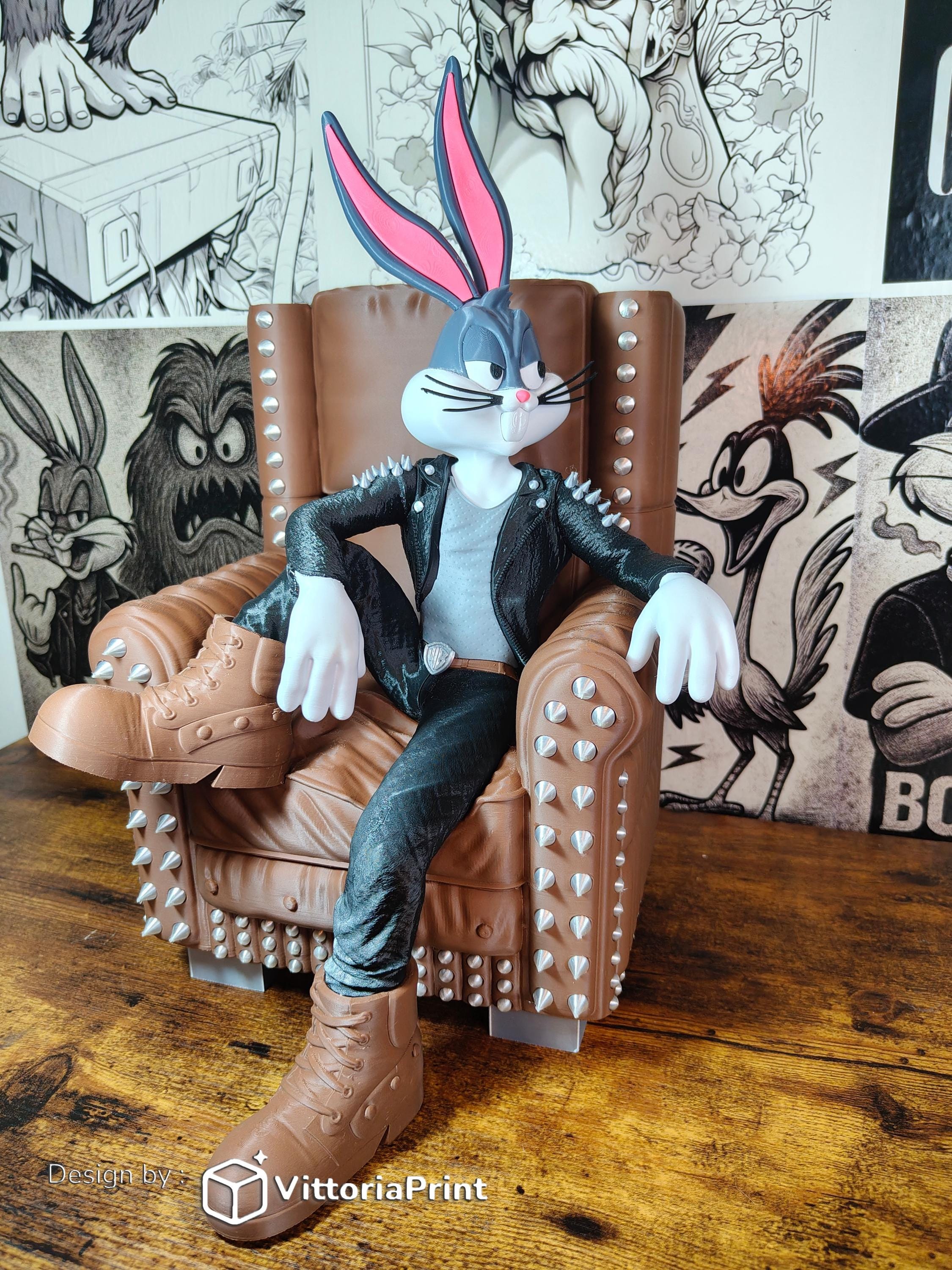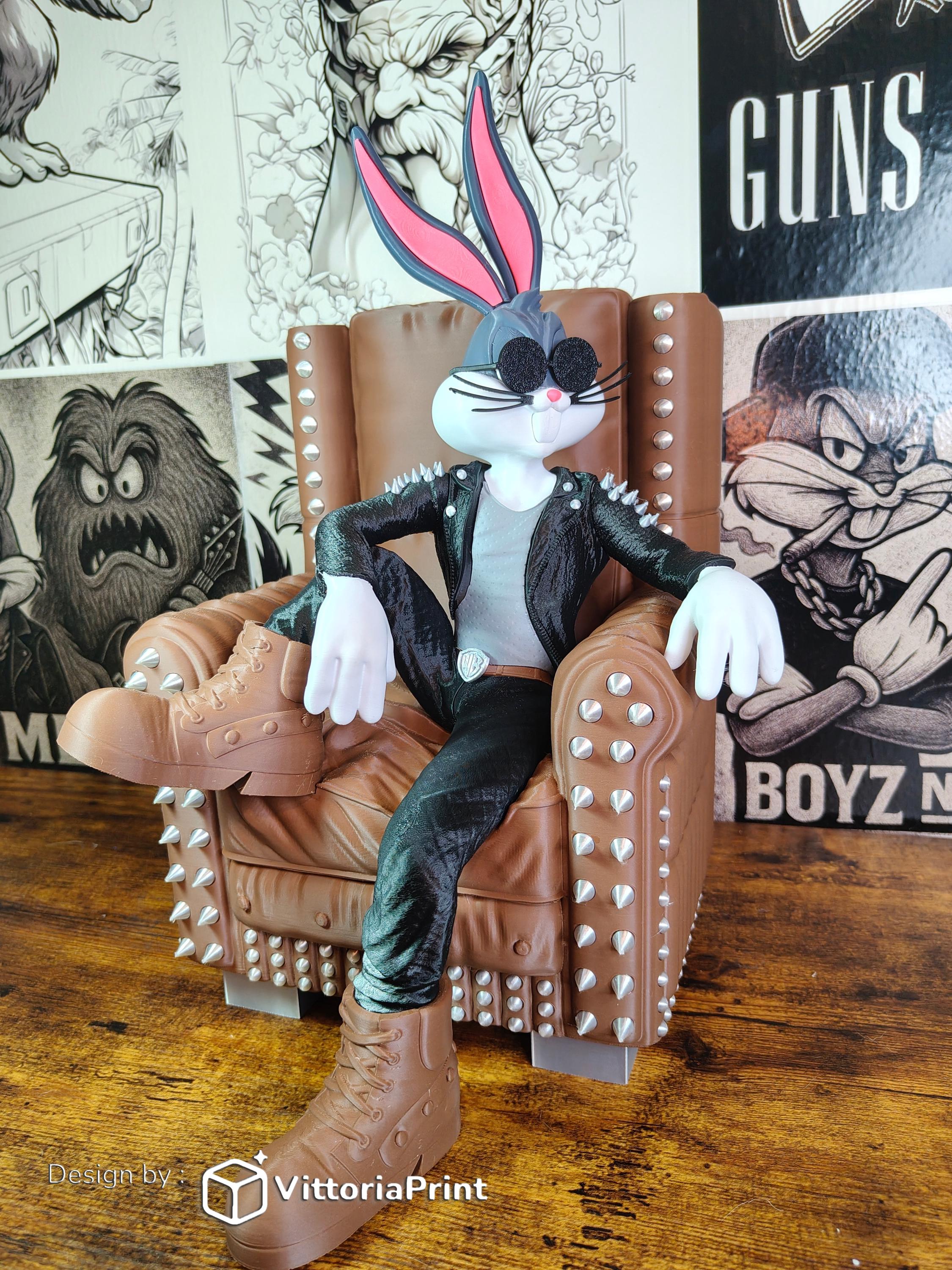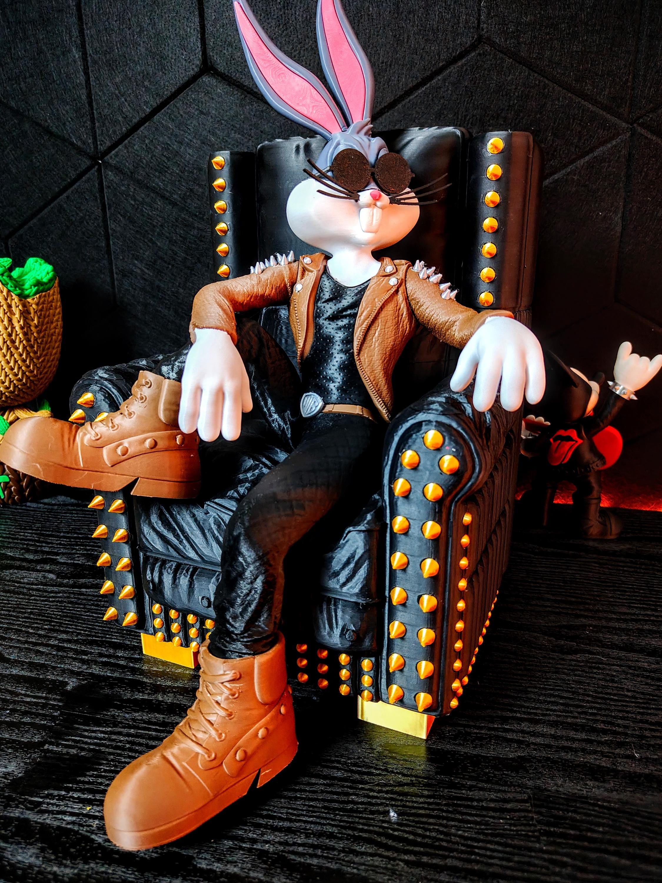 Upgrade your collection with this luxury rock star bunny figure, designed as a full scene collectible. This 3D printed statue captures a powerful metal-inspired character relaxing in a detailed armchair, creating a bold and cinematic display piece.