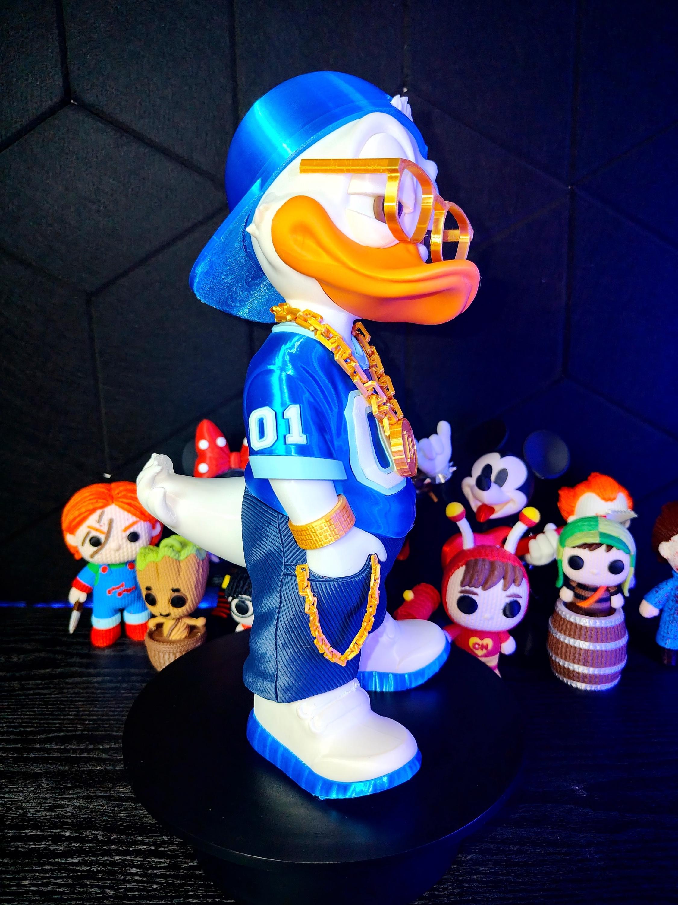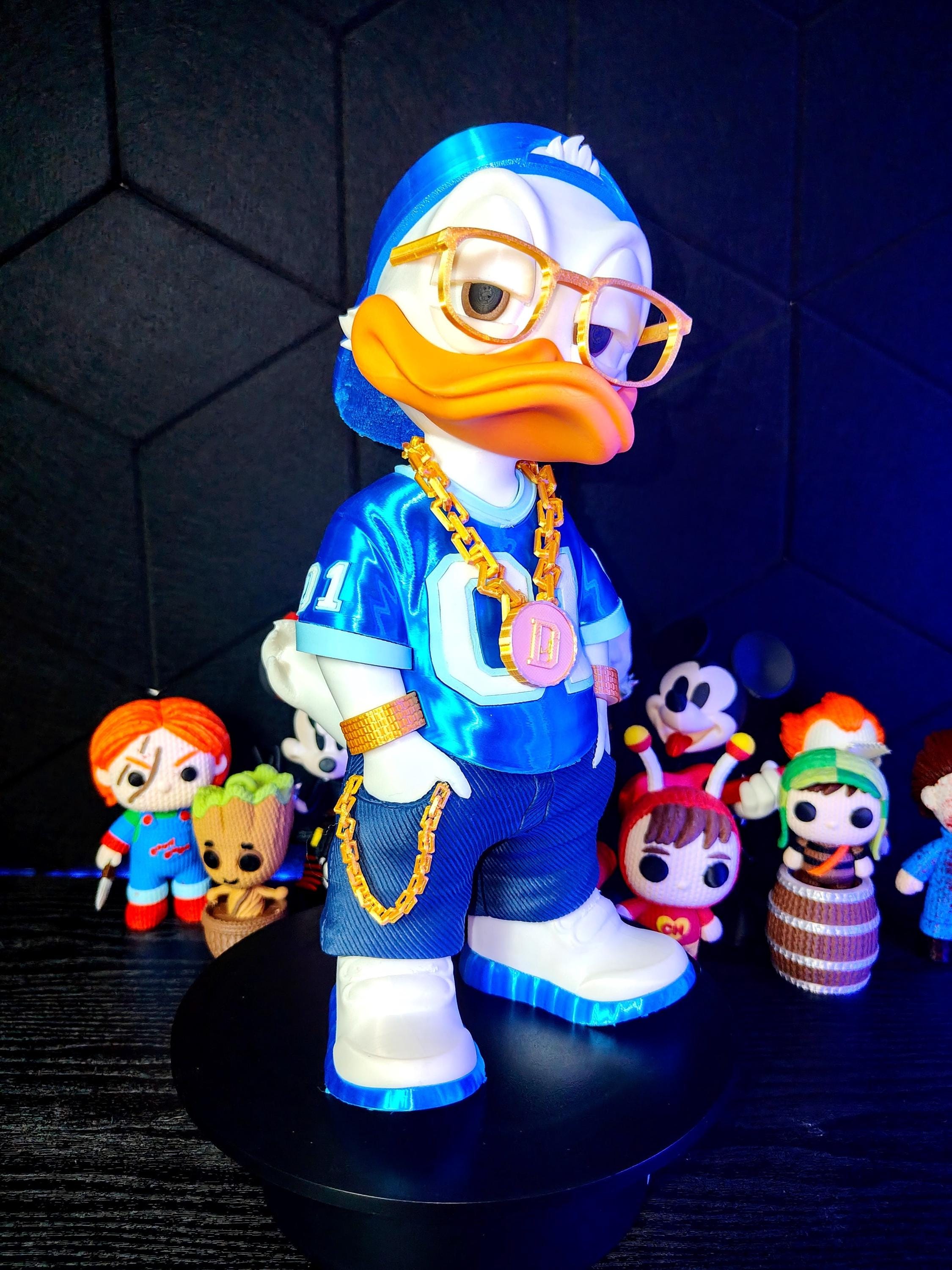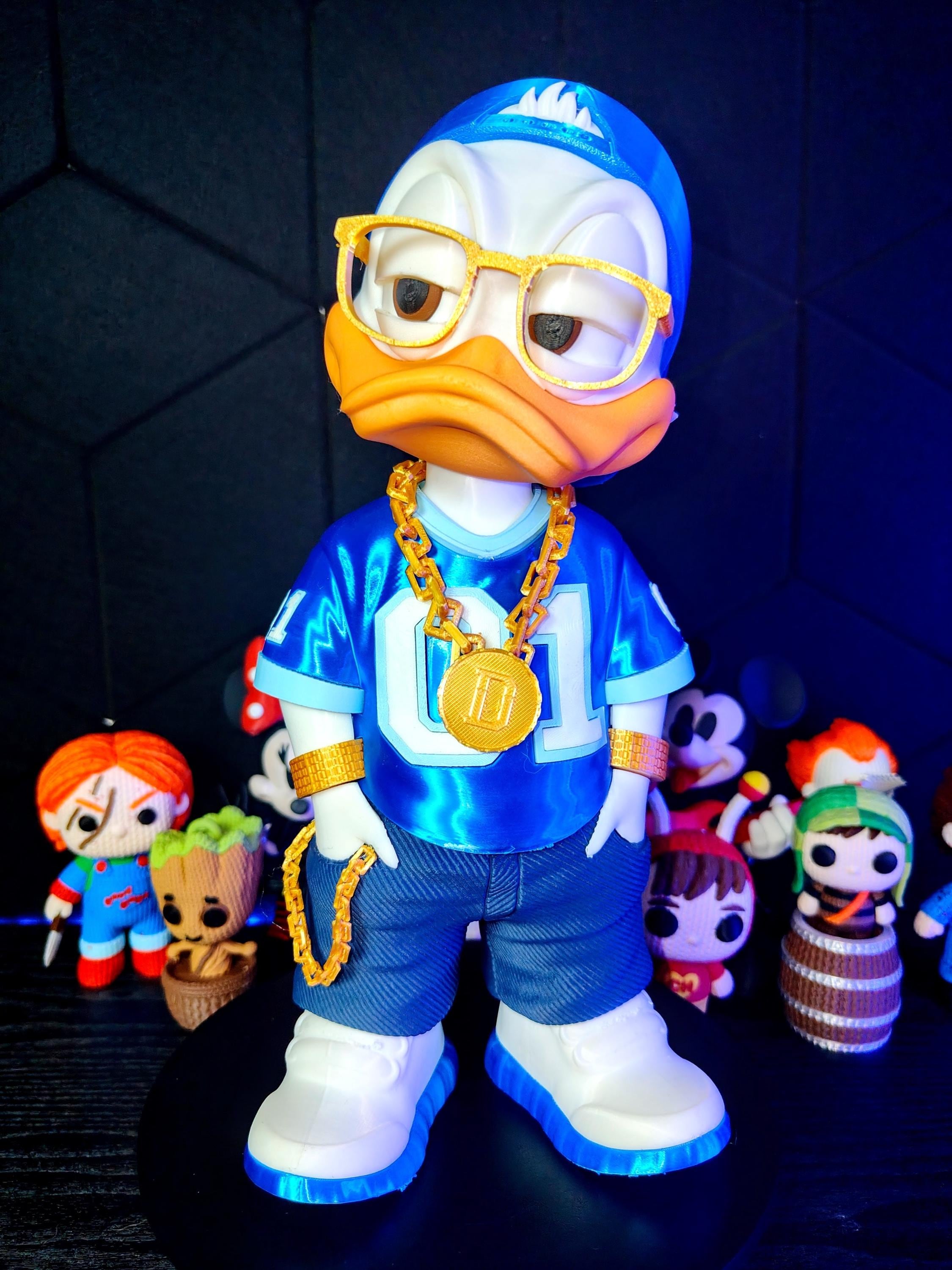 Add attitude and style to your space with this urban duck streetwear figure. Designed with a bold hip hop aesthetic, this 3D printed figurine features a confident pose, gold chain accessory, and modern outfit.