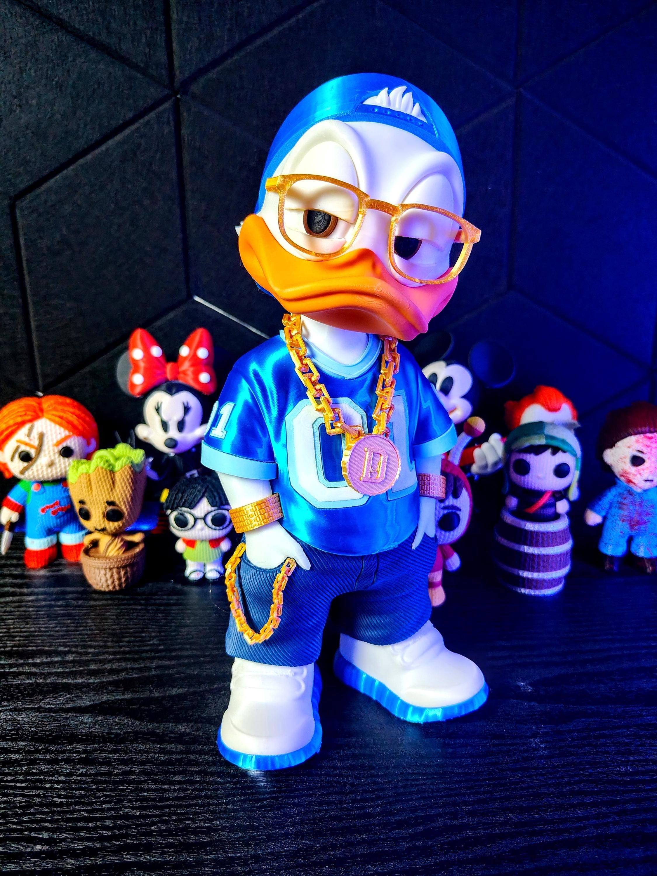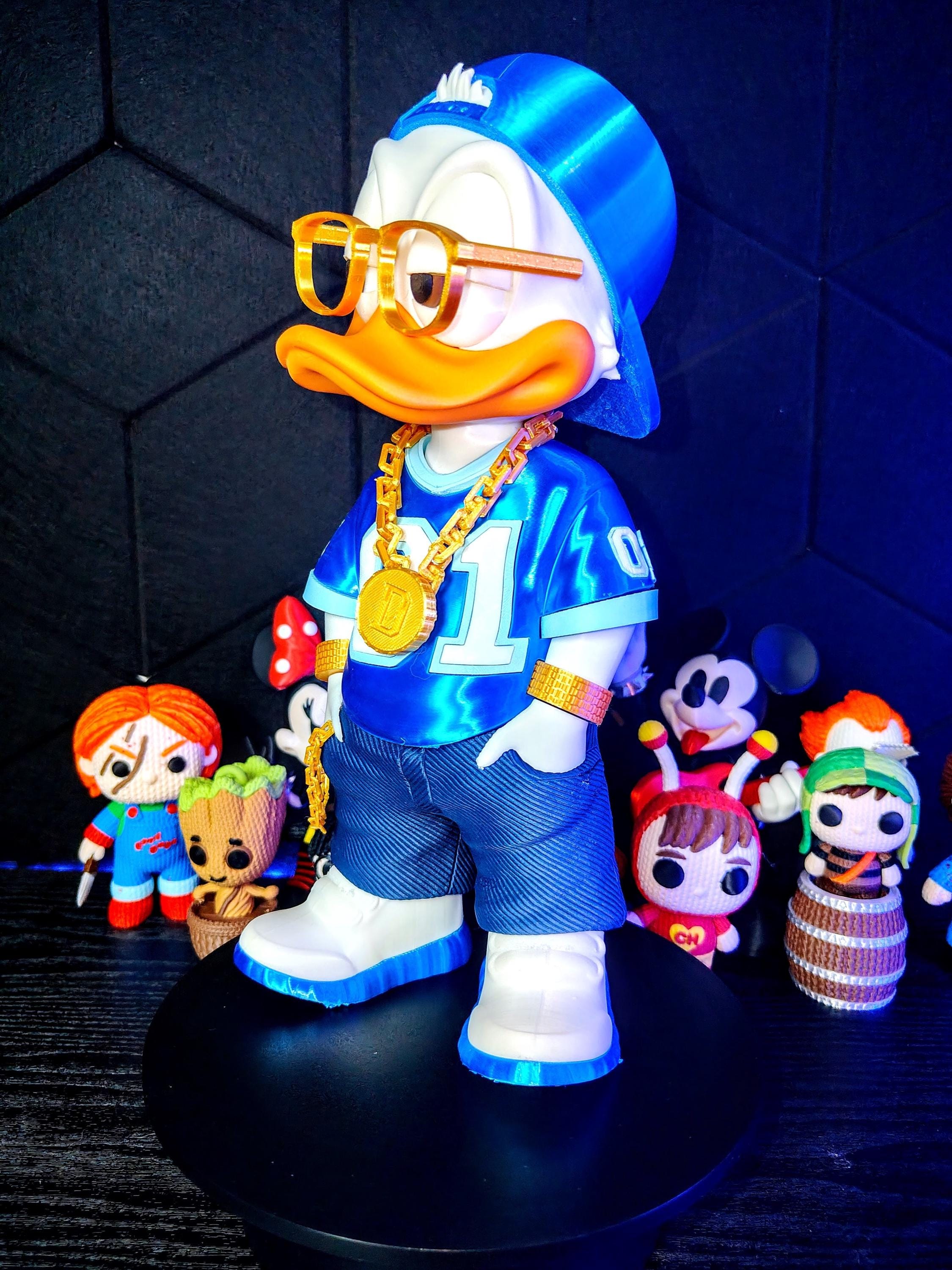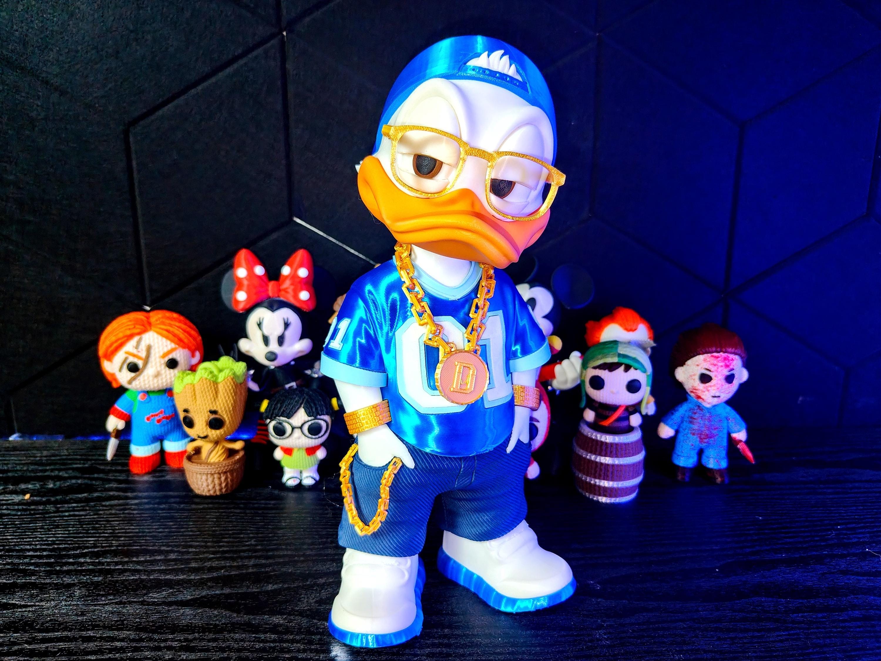 Add attitude and style to your space with this urban duck streetwear figure. Designed with a bold hip hop aesthetic, this 3D printed figurine features a confident pose, gold chain accessory, and modern outfit.