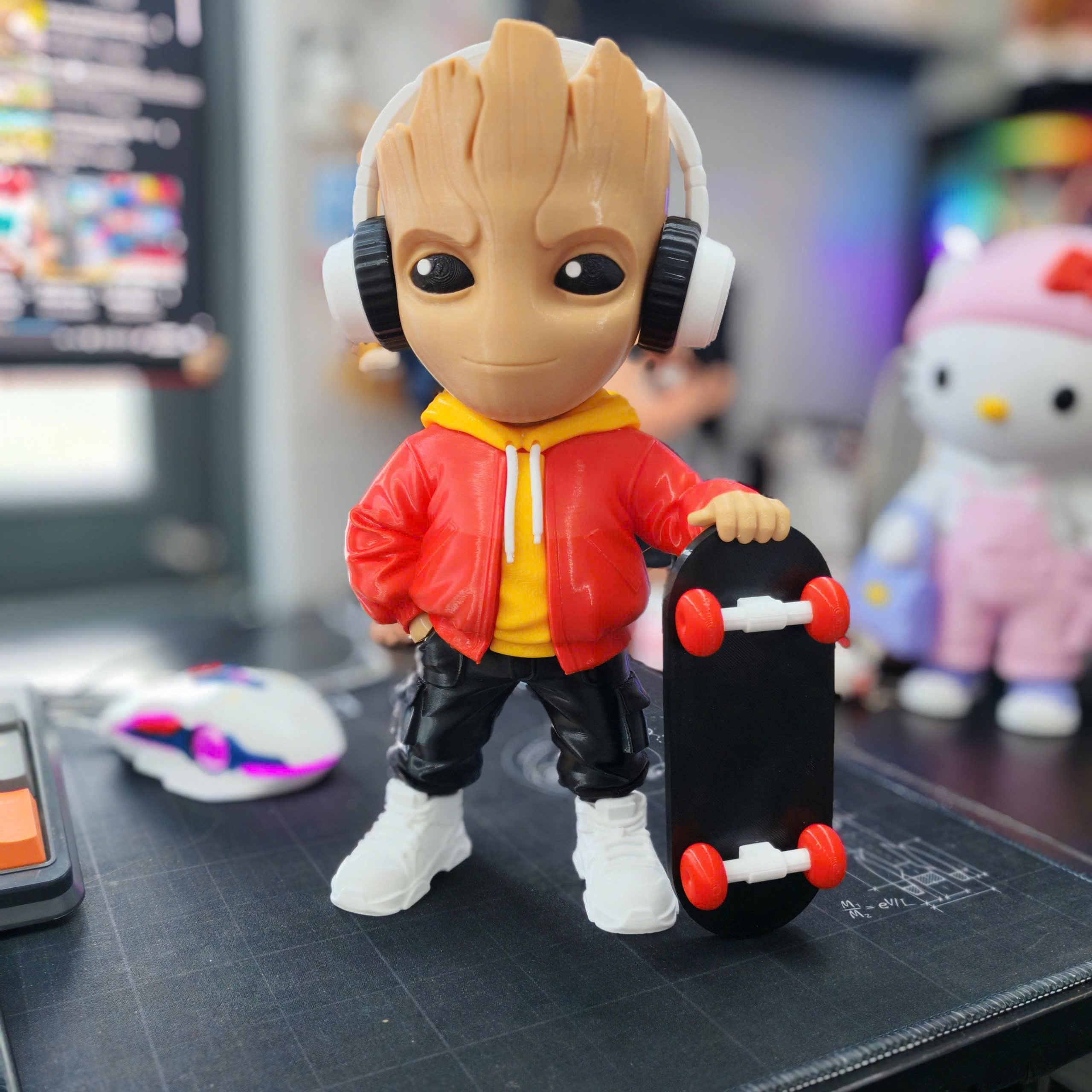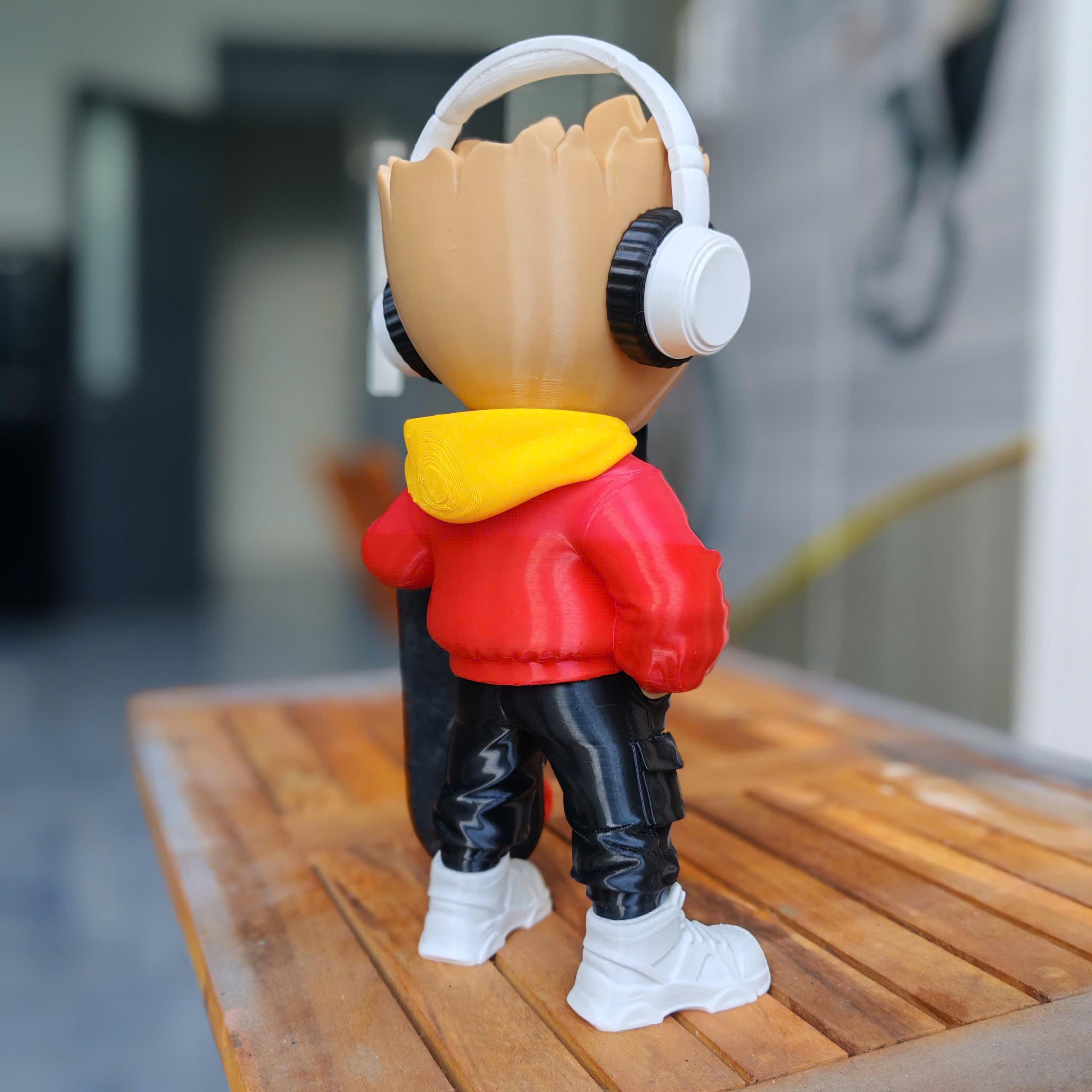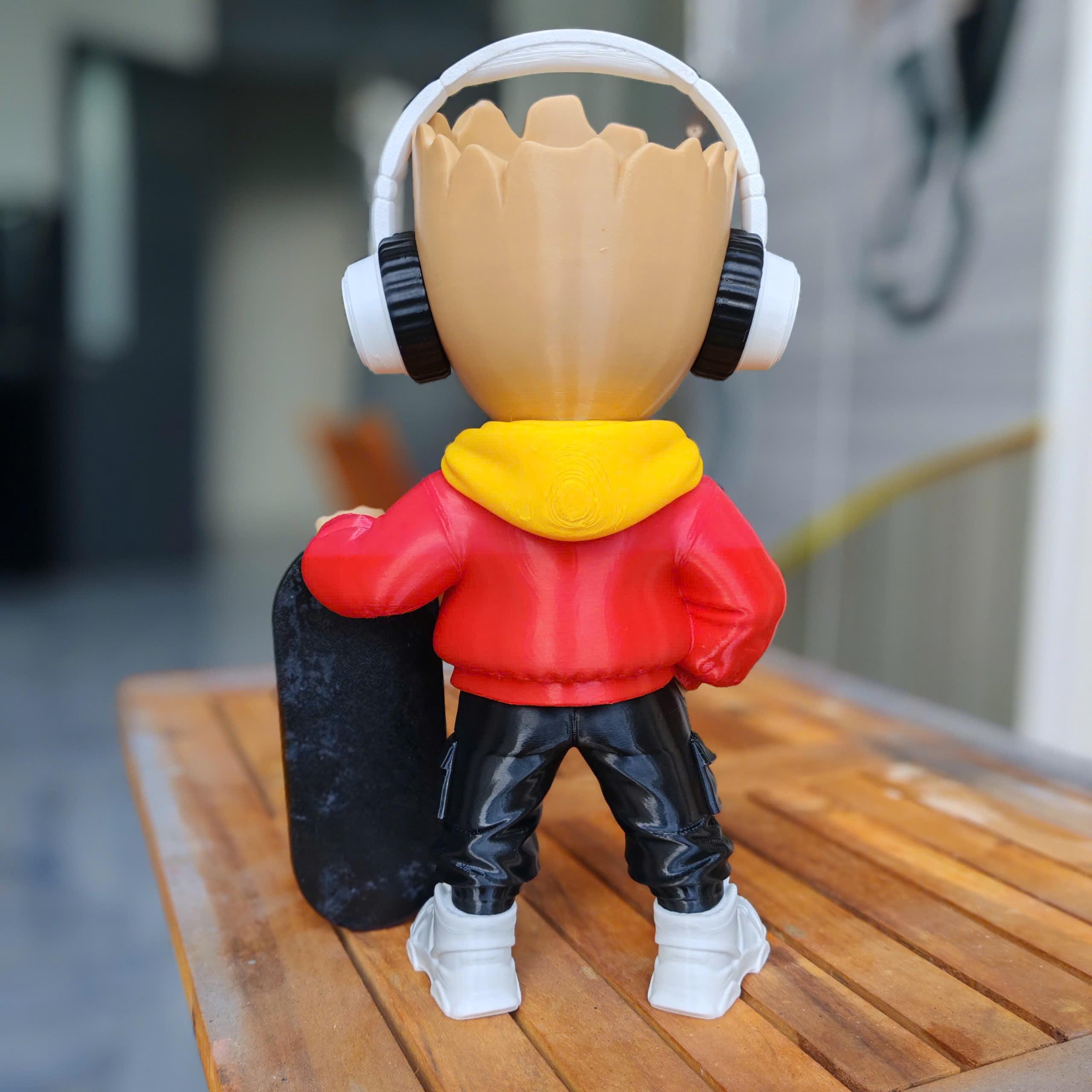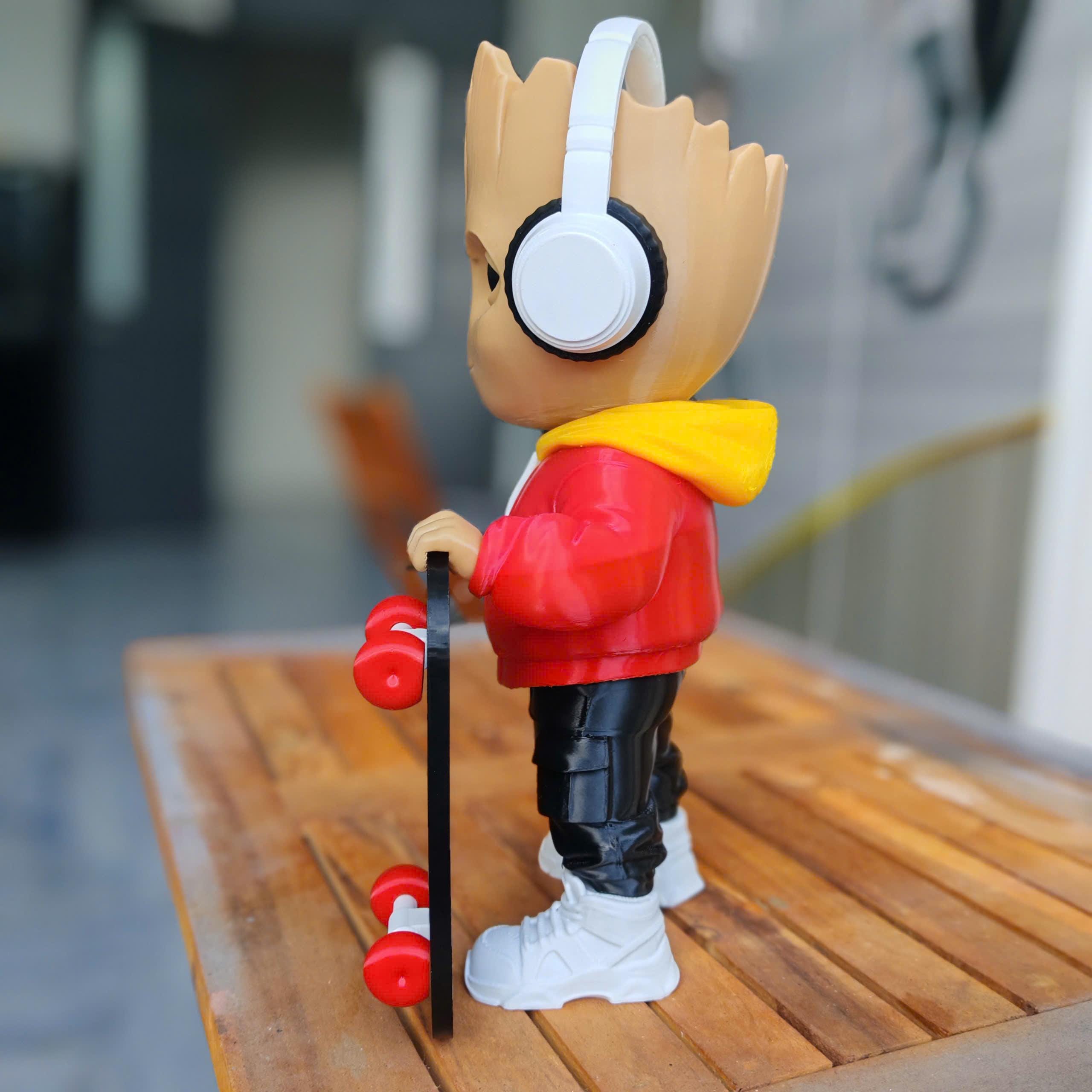 Designed with a modern hoodie, headphones, and skateboard, this 3D printed collectible blends nature with street culture for a unique and eye-catching look.